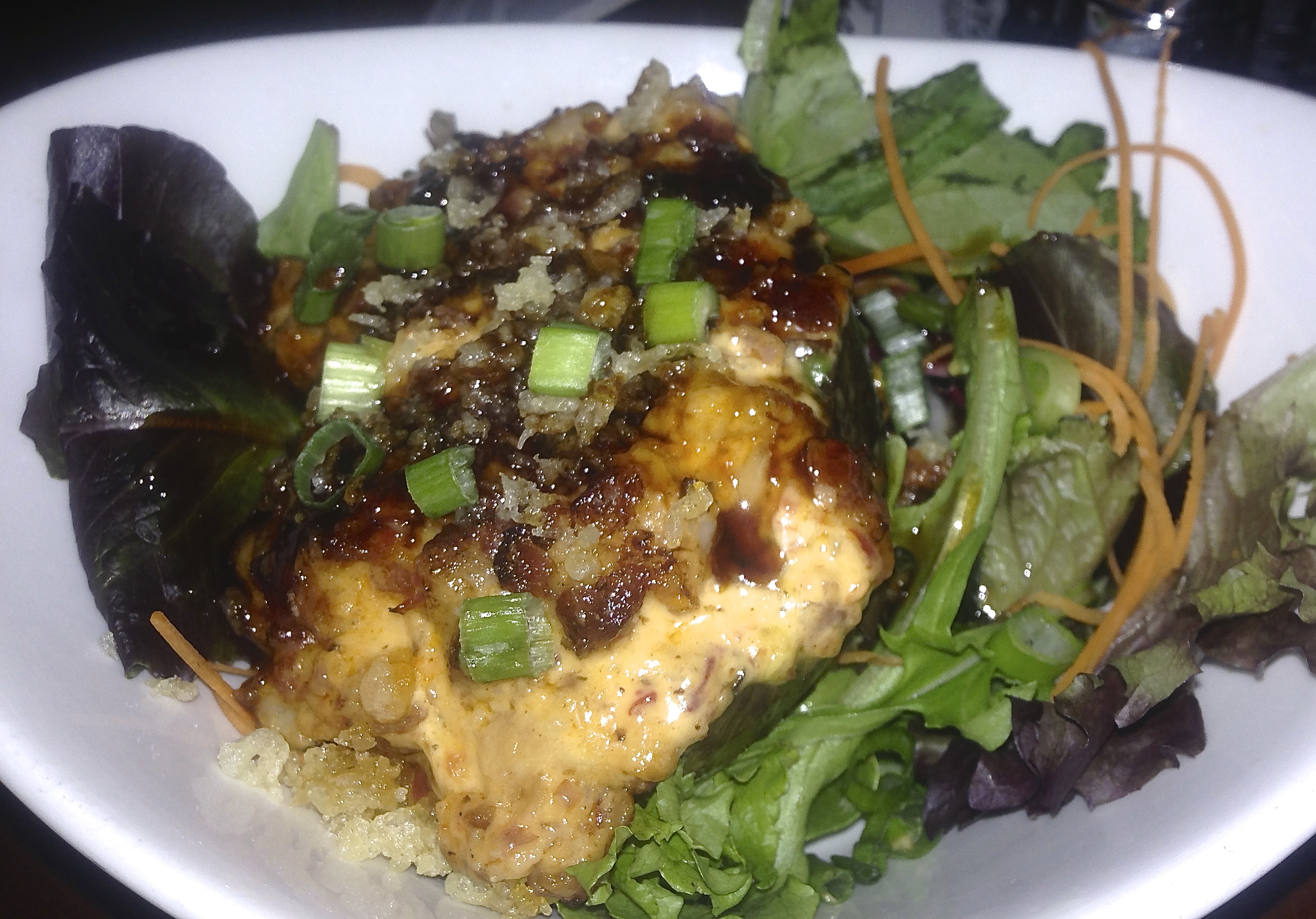 We start things off with a baked avocado. It comes with bacon and melted cheese, not the healthiest thing to do to an avocado, but it’s really good. If this is one of the five starters on the wall, go for it.