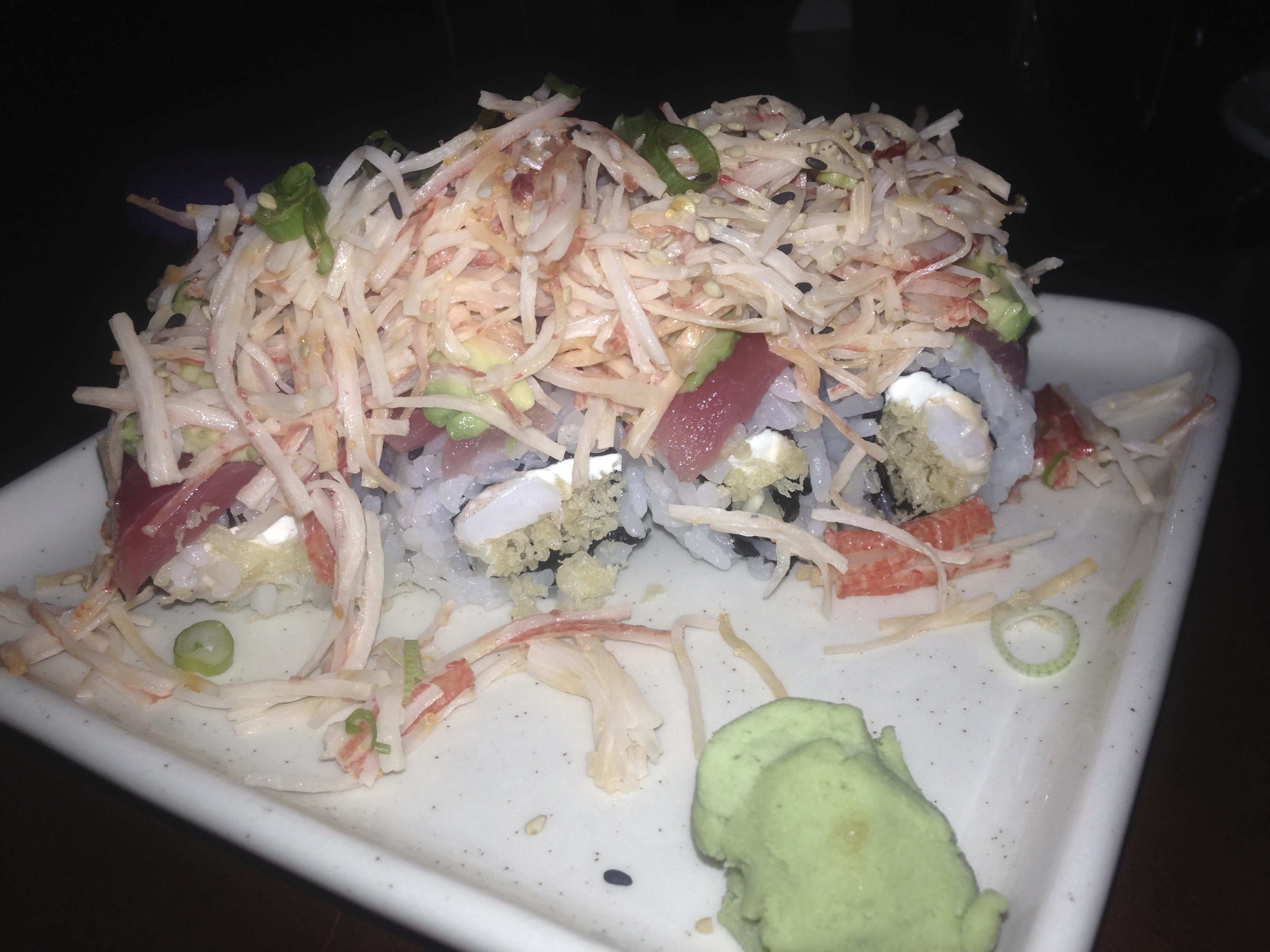 (Editor’s note: We visited in November and can’t remember what was in this roll.) I think we see some tuna on top. Nevertheless, this one tastes as good as it looks.
