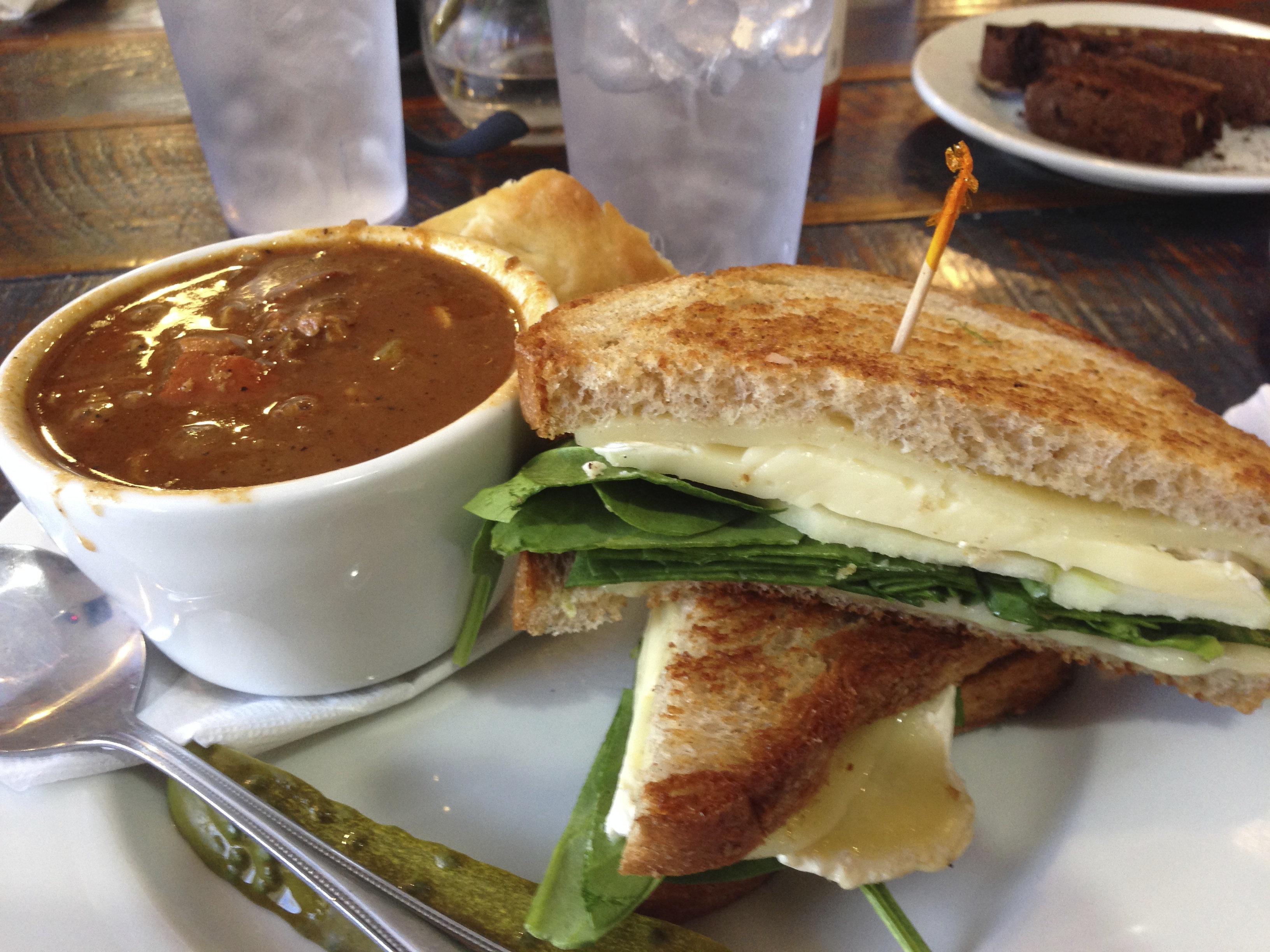 The lunches at Big City are as good as the breakfasts. The grilled cheese has gruyere and provolone. It comes with a bowl of spicy gumbo, which is the side of the day today. I would have liked the cheese melted a little more.