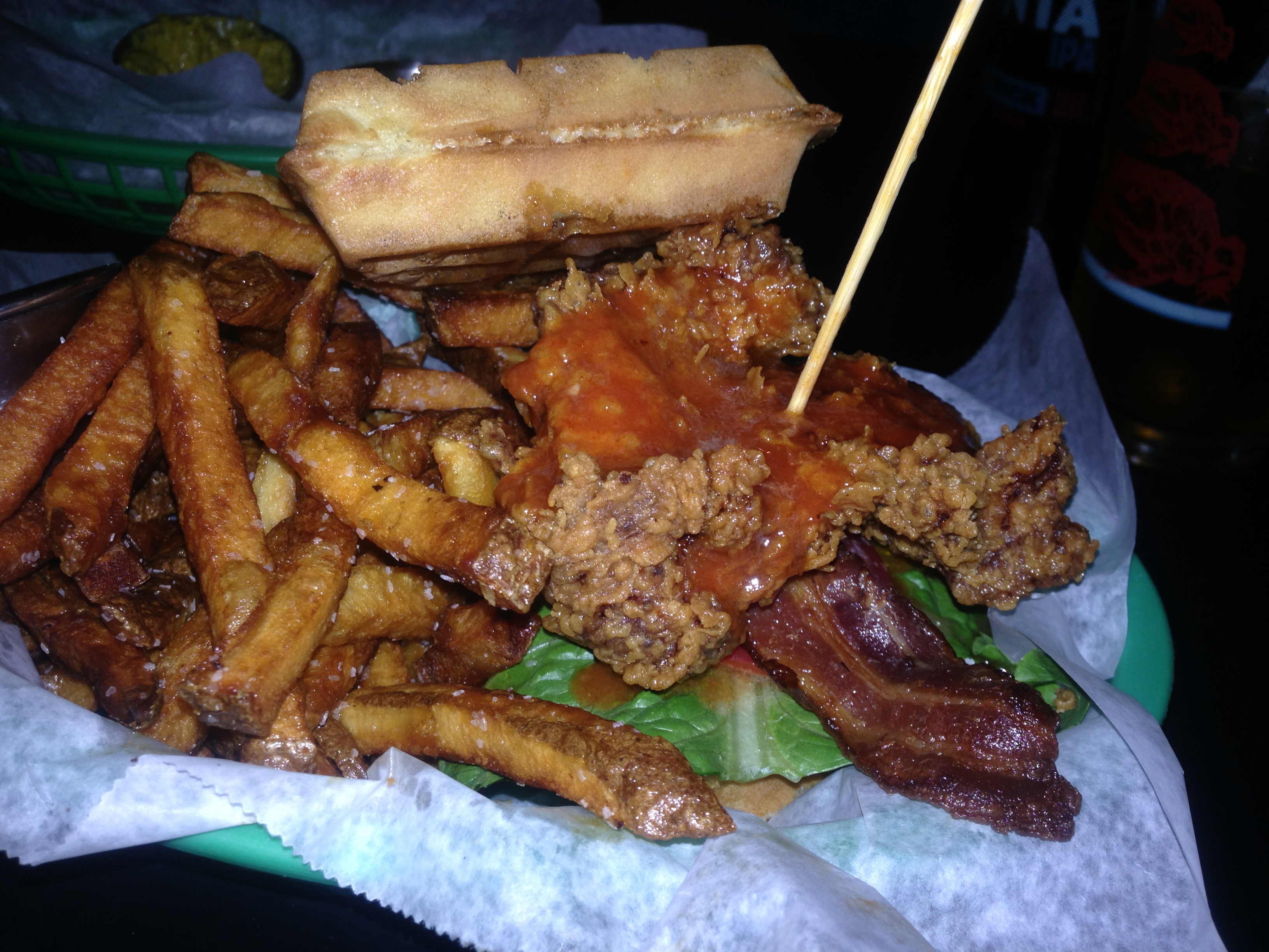 The chicken and waffle club is just as advertised. The waffles make up the “bread” portion of the sandwich. Inside is fried chicken, bacon, lettuce, and tomato. The whole thing is topped with bourbon maple syrup. This is one of the best sandwiches ever. Order this and experience nirvana.