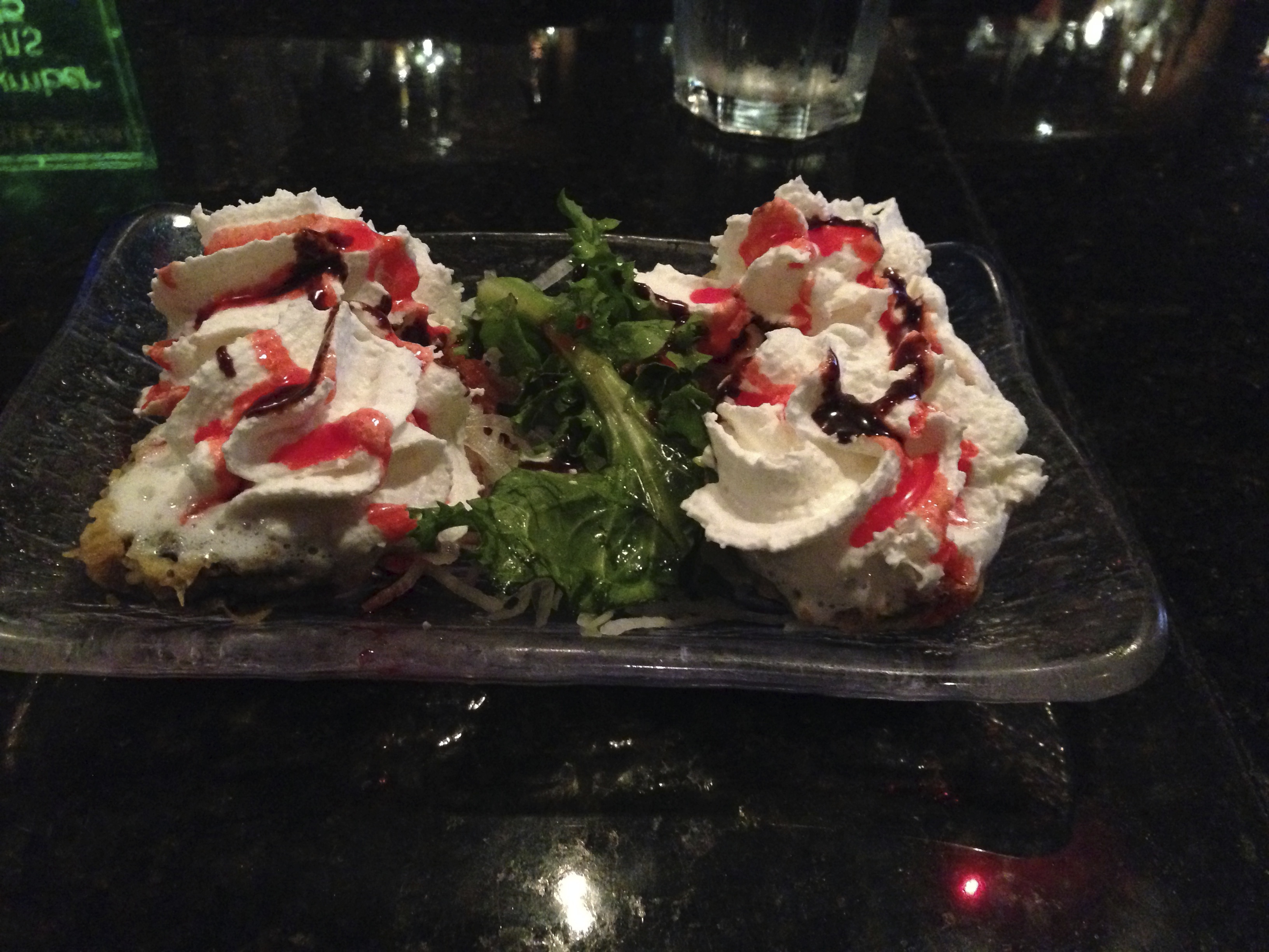 How’s this for a plate of sushi. We actually order a couple more rolls later. The great thing about the menu here is that you can go mild or spicy. The TNT roll comes with wasabi mayo that packs quite a punch. There is such a good selection and variety that it’s hard to make up your mind. We shall go back for a further sampling.