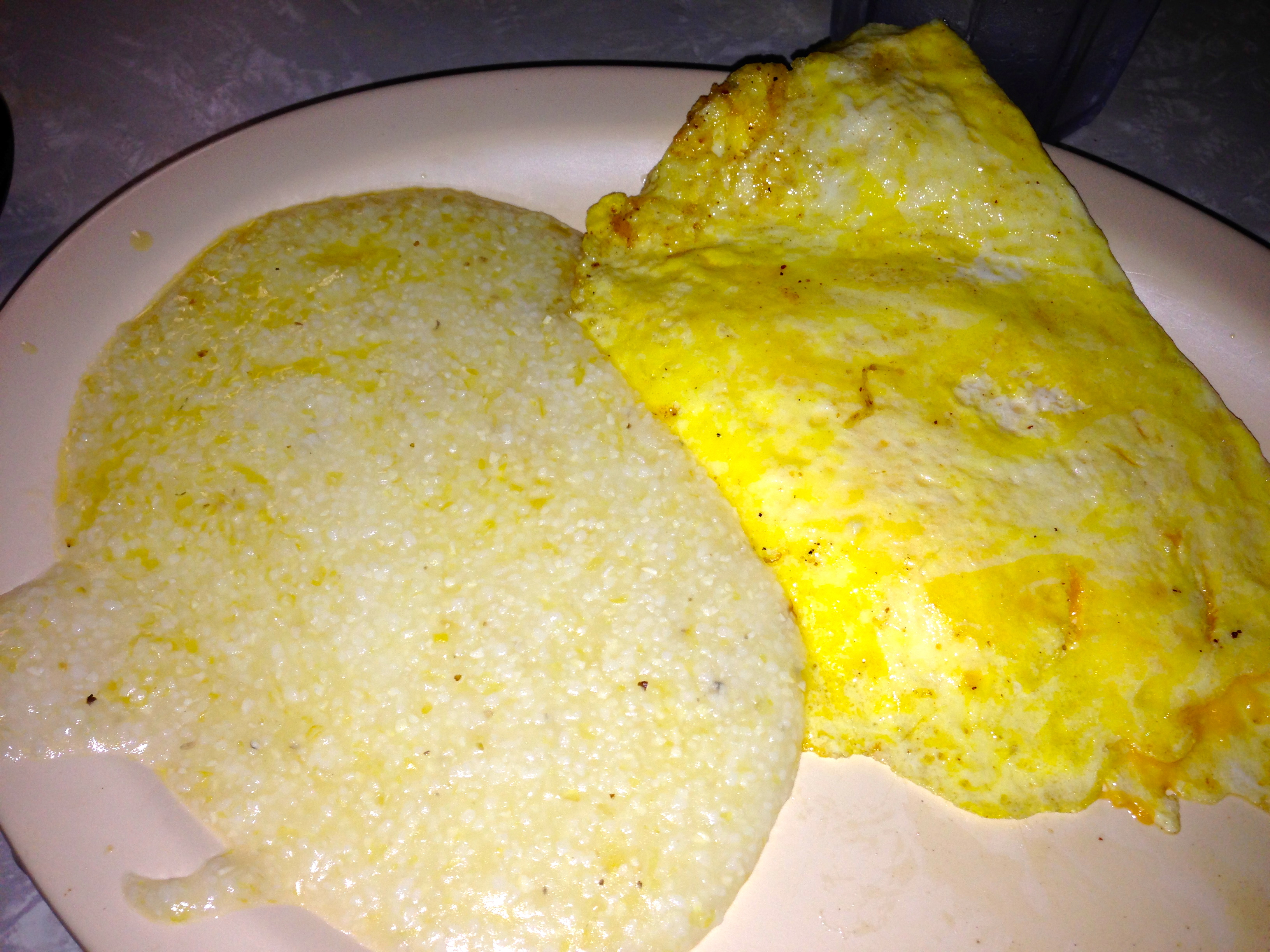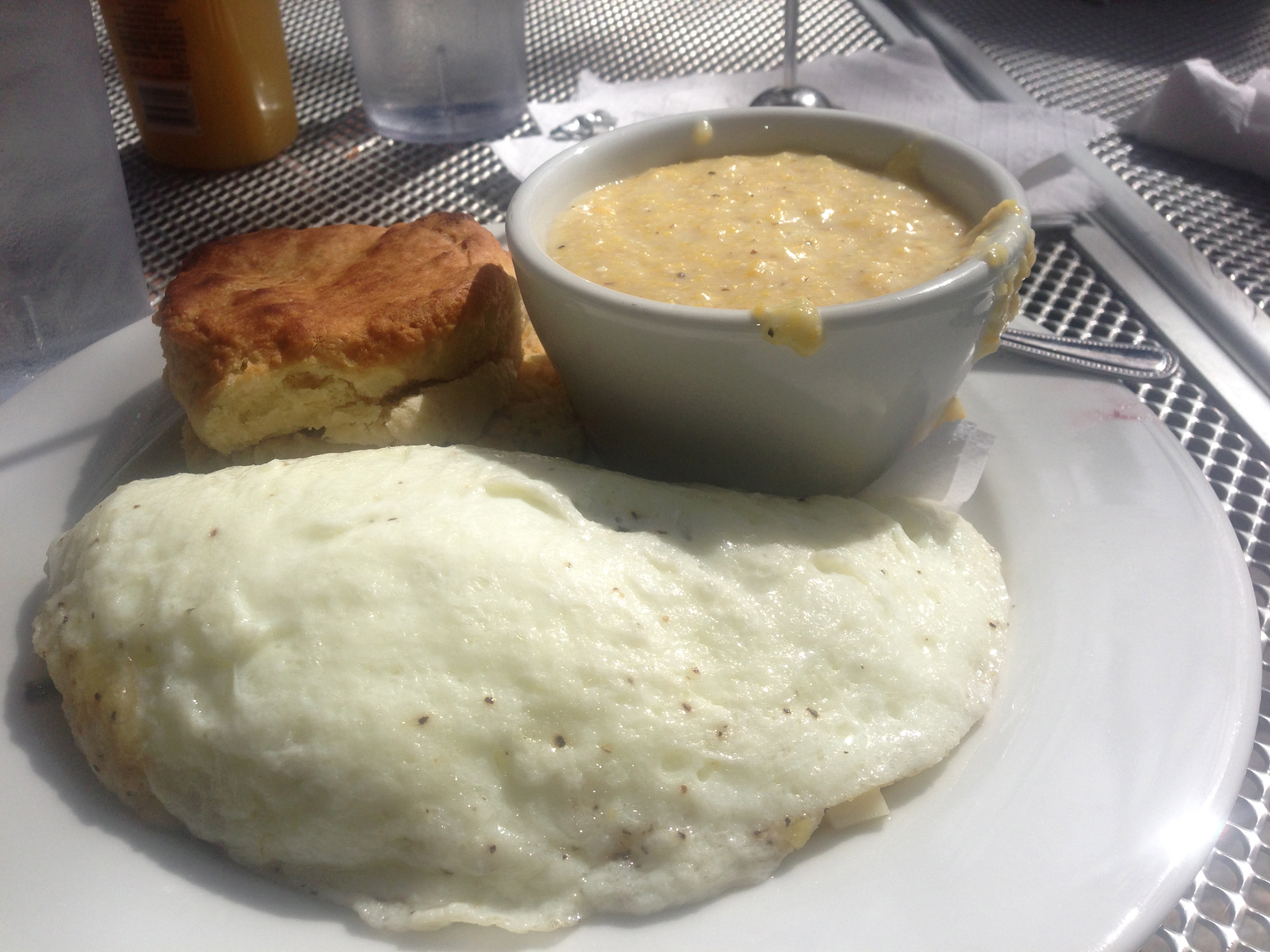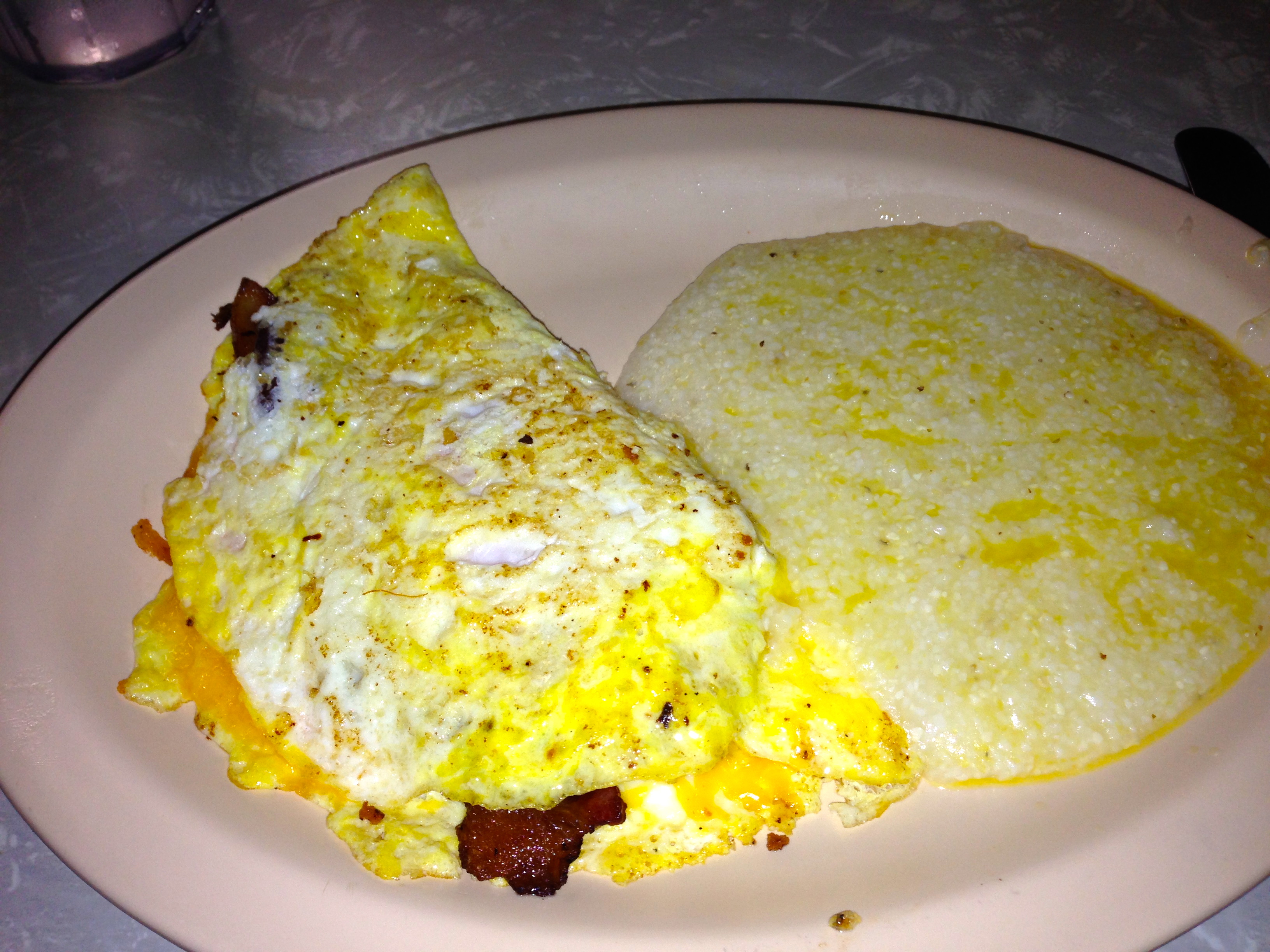 I get a cheese omelette. Pretty boring, but it’s good. Notice that we got grits here, which were not available at The Grit.