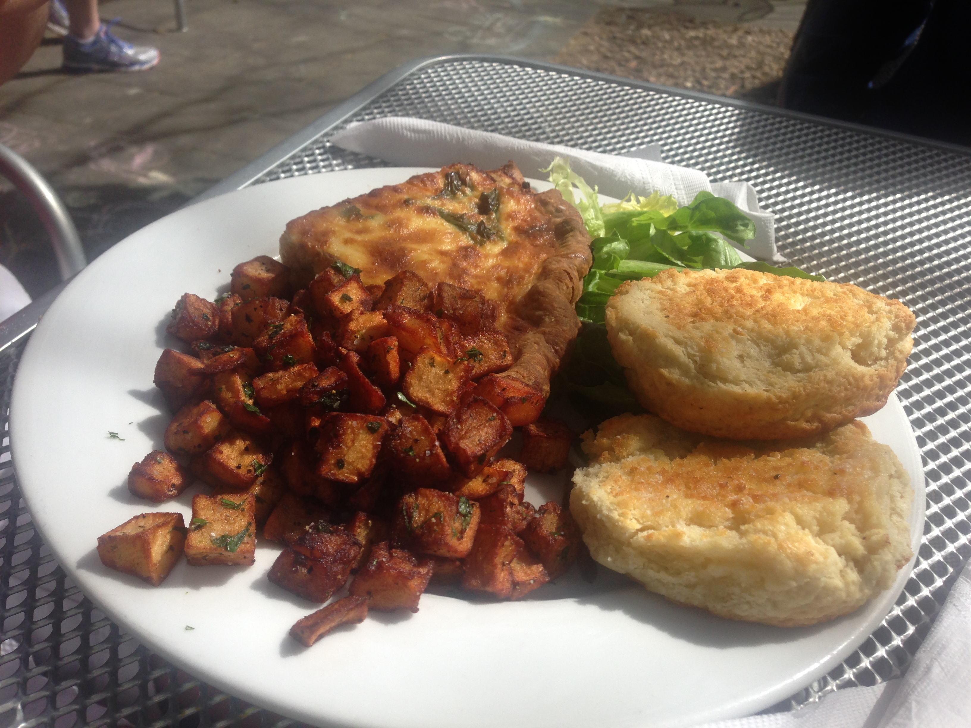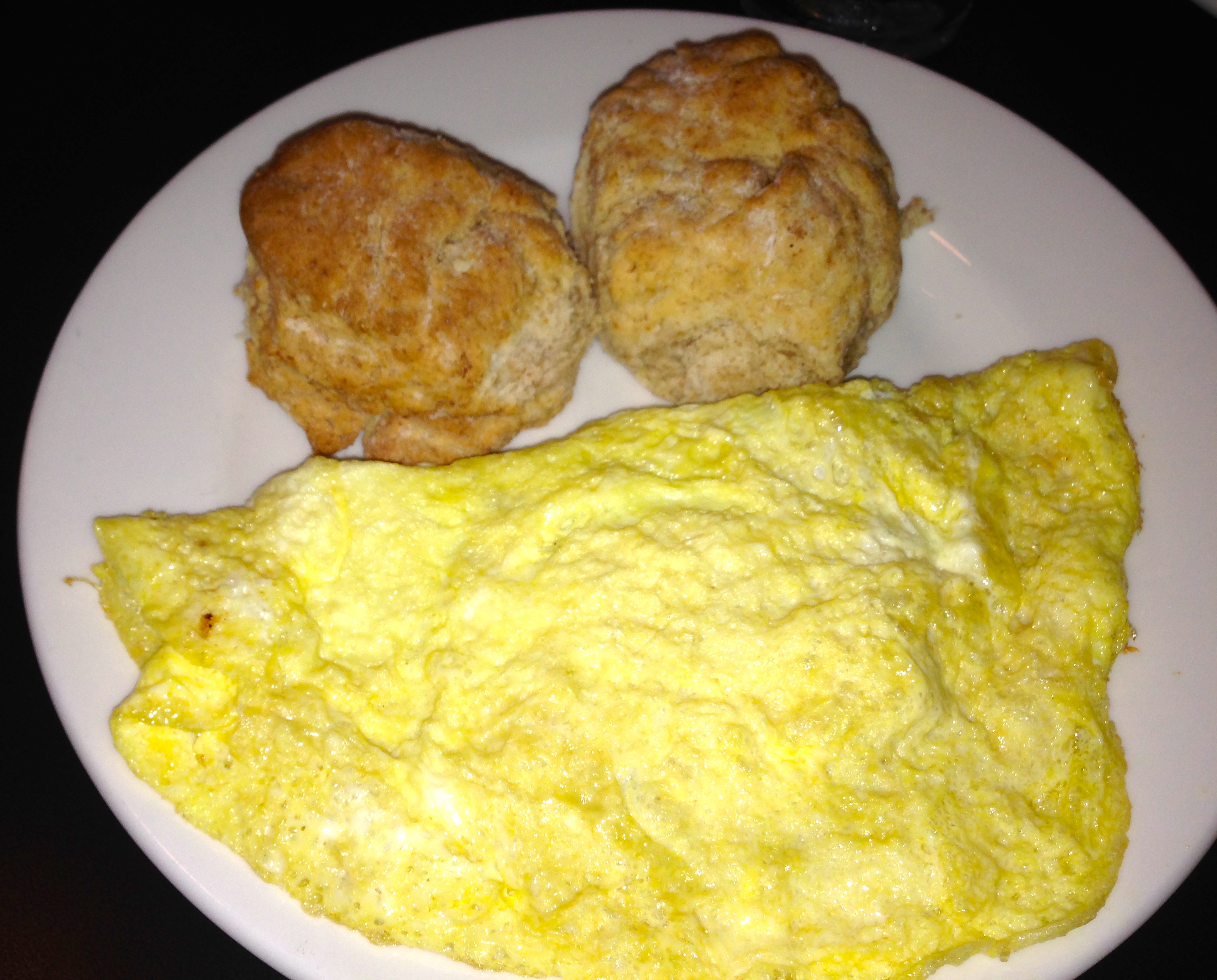 We also get a spinach, tomato and cheese omelette. It was supposed to come with grits, but they are out of grits at 10:30. No grits at The Grit. They change it to potatoes, but they are out of them too. They bring it to us with an extra whole wheat biscuit instead. It’s always something here.