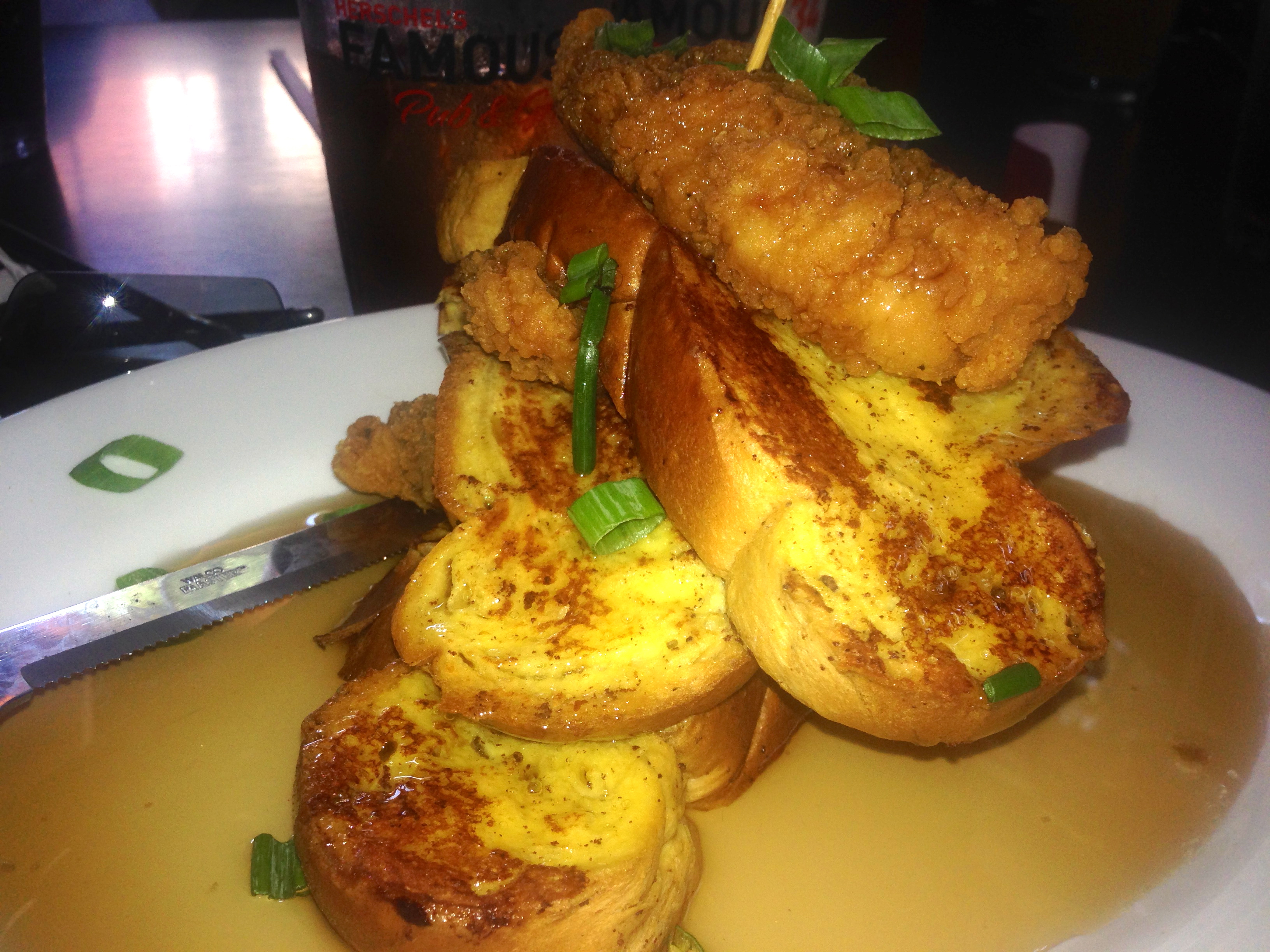 Behold Mama’s Chicken and French Toast. Although not as good as the World Famous chicken and waffles sandwich, this huge plate is tasty and filling. Don’t try to eat it alone, although I almost finished it. There are three pieces of french toast with three large, plump hunks of fried chicken breast. Then they drown it in syrup. If Herschel’s mother served him this dish, it would explain why he grew up to be the perfect physical specimen.