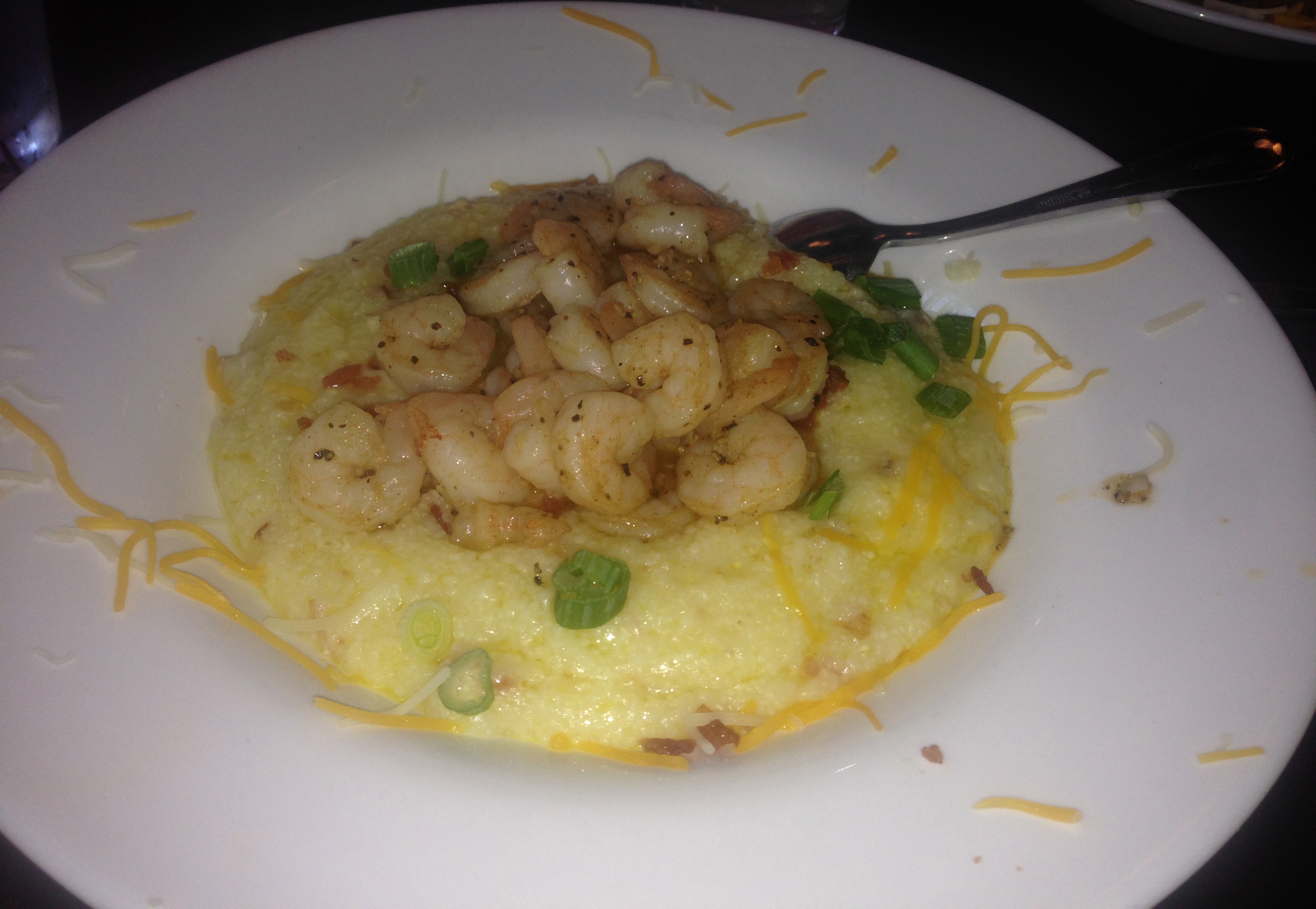 The shrimp and grits come on a bowl of cheese grits. The shrimp is reported to be good, but the grits are described as too salty by two of our diners.