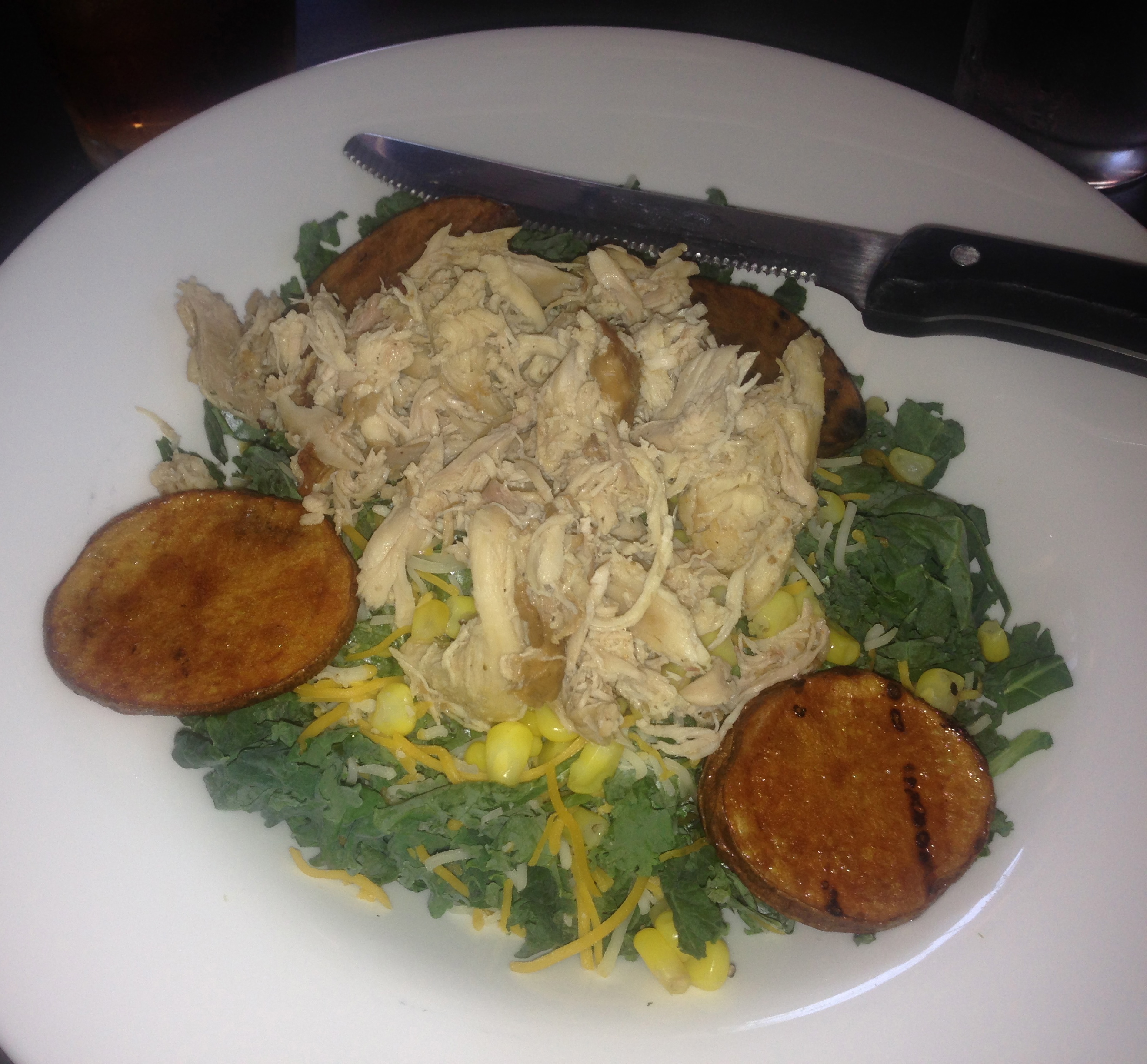 The chopped kale chicken salad features a generous portion of smoked chicken over a bed of kale, cheese and corn. The chicken is tender and perhaps a bit too salty. We order a side of fresh-fried kettle chips (not pictured), which may be the second-best thing that gets delivered to our table.