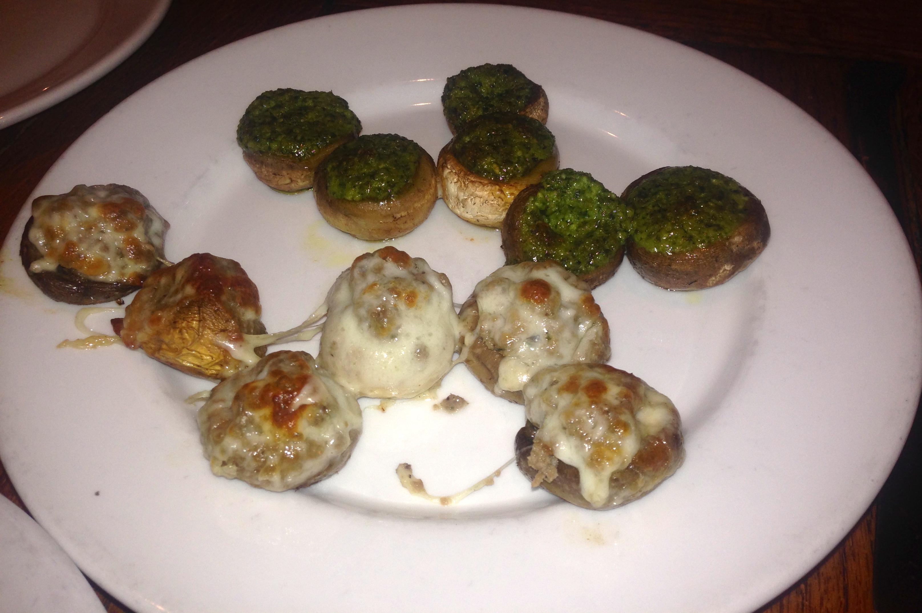 The stuffed mushrooms come with pesto inside of half of them and cheese in the other half. This is a nice, light appetizer that’s easy to share.