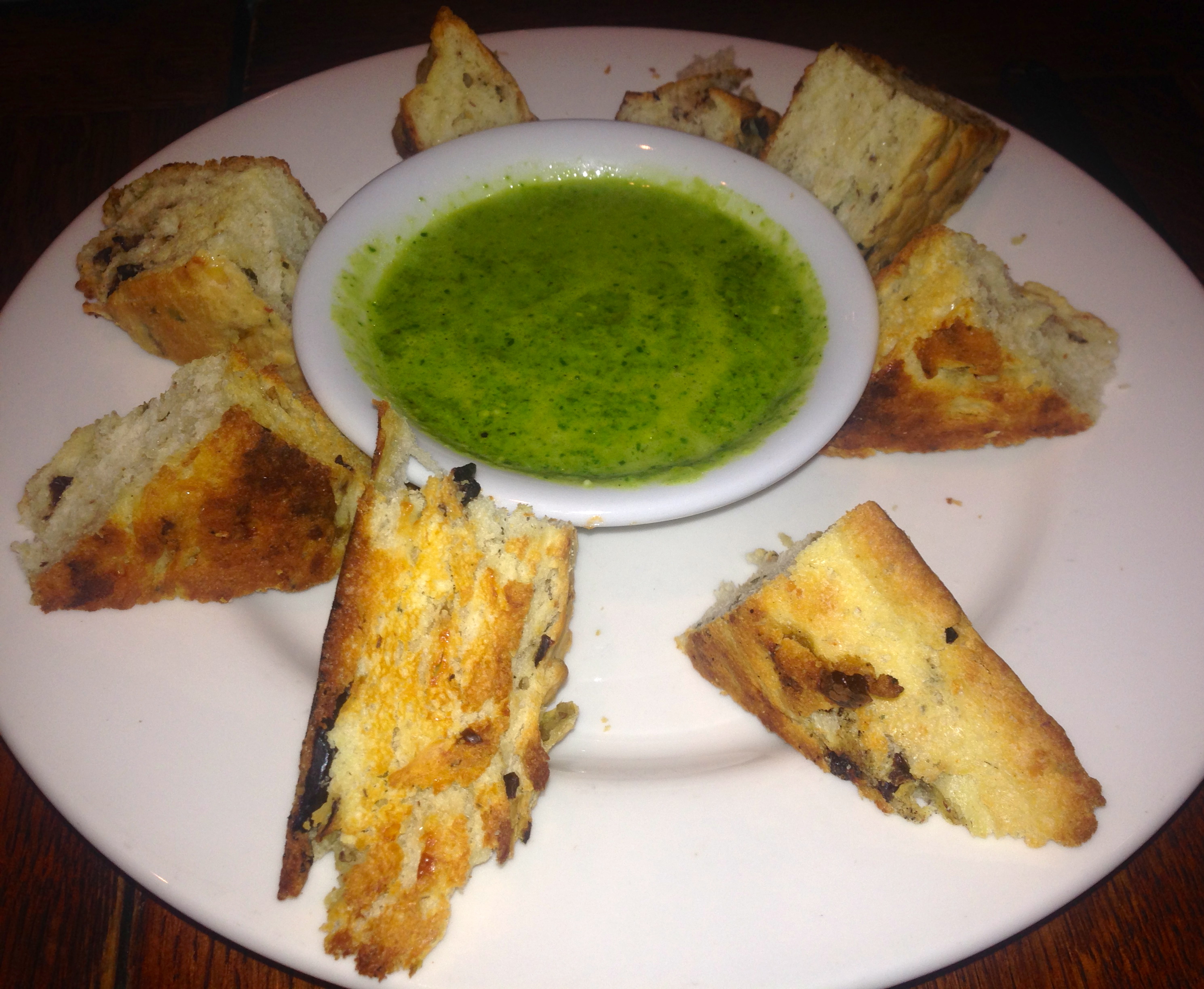 We also order the foccacia, which comes with a spinach-pesto sauce. Since they bring you bread to your table, you can probably avoid having bread with your bread. It’s good, but we would have been better off just eating the bread on the table.