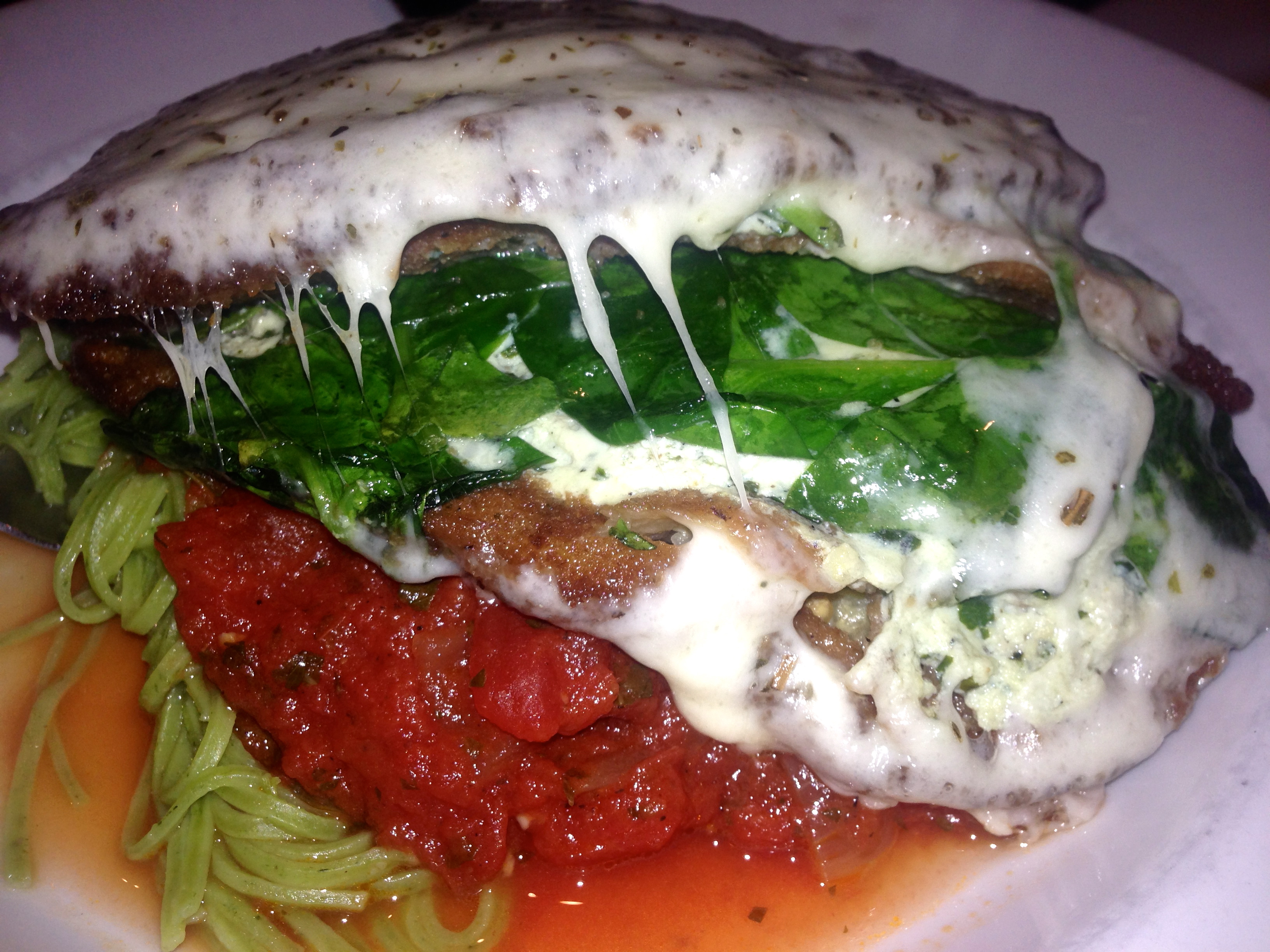 My date helps me eat this, and some goes home with a starving college graduate. He’s not starving after eating here. The eggplant florentine is a huge plate of eggplant parmesan with spinach added. It’s all served over spinach pasta. Molto benne! This is the best thing we eat tonight. It is a very large portion, which means you are going to want to share it with your date, unless you are really hungry.