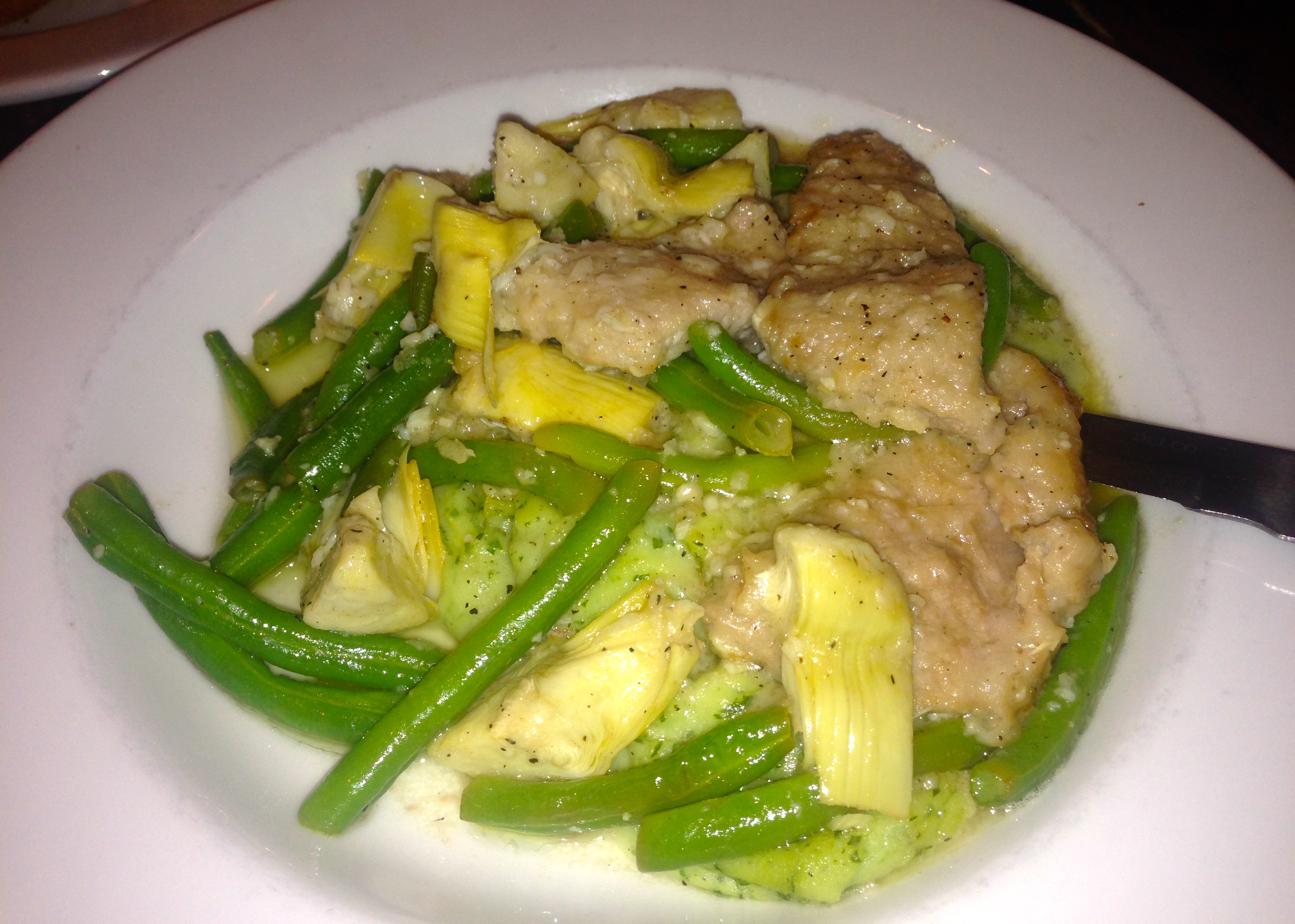 Here’s another special. The veal comes with green beans and artichoke over spinach mashed potatoes. The veal is tender and has a nice lemon flavor to it. The mashed potatoes are a bit garlicky for my taste, but overall this is a successful dish.