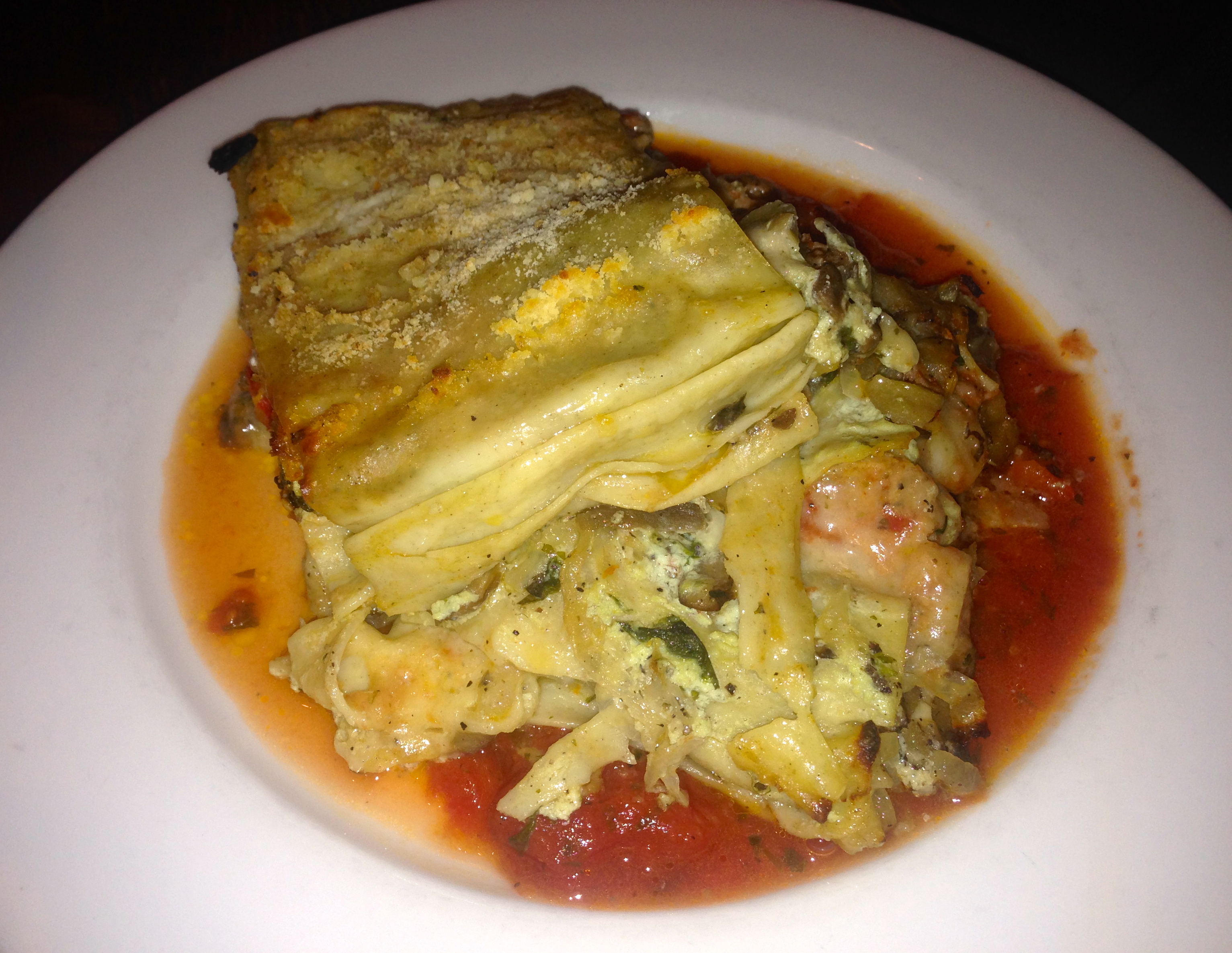 This lasagna is tonight’s special. It has sausage, onions, and peppers in it. A more traditional lasagne is also available.