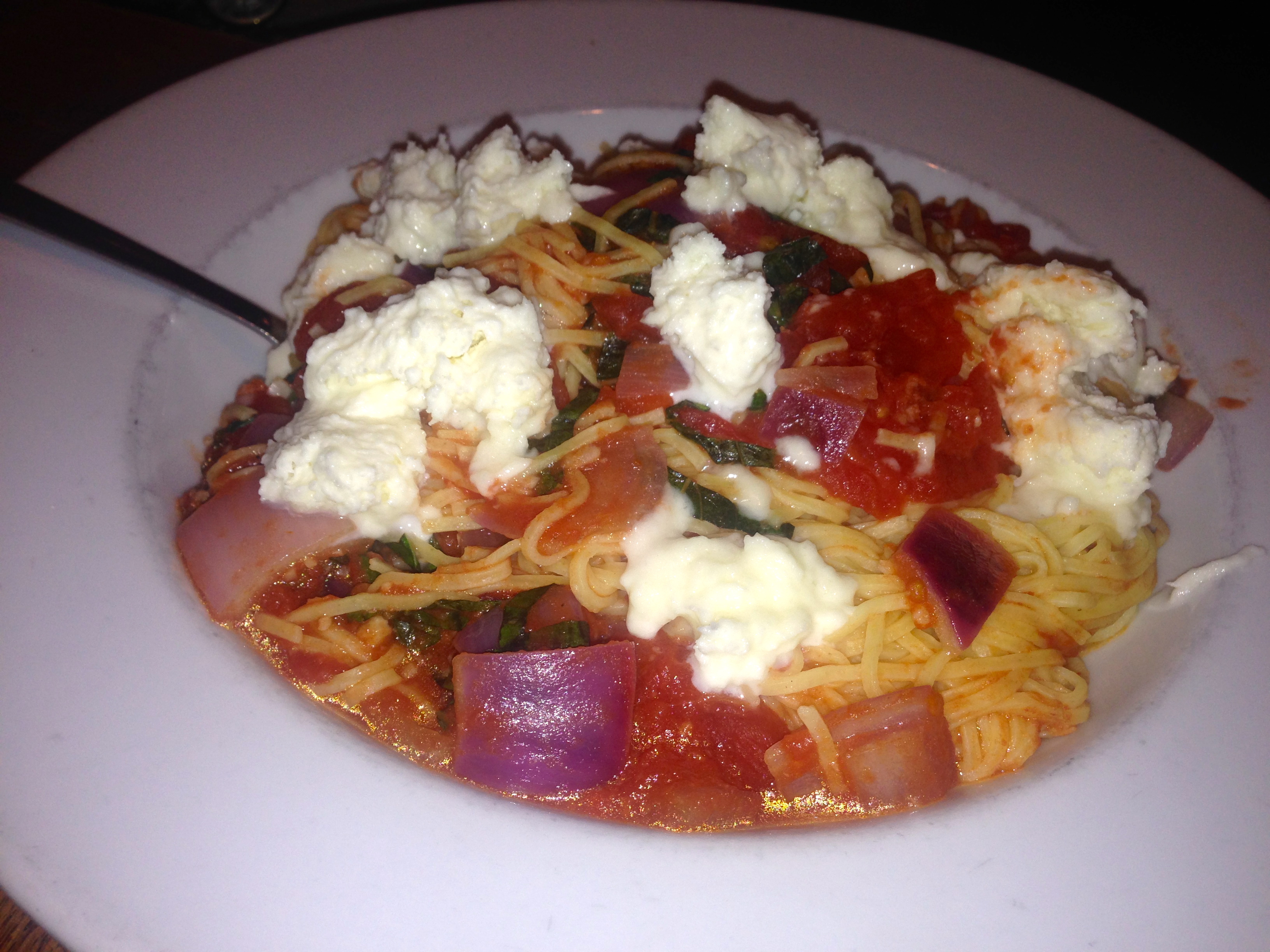 The pasta margherita comes with fresh mozzarella in a white wine and garlic sauce.