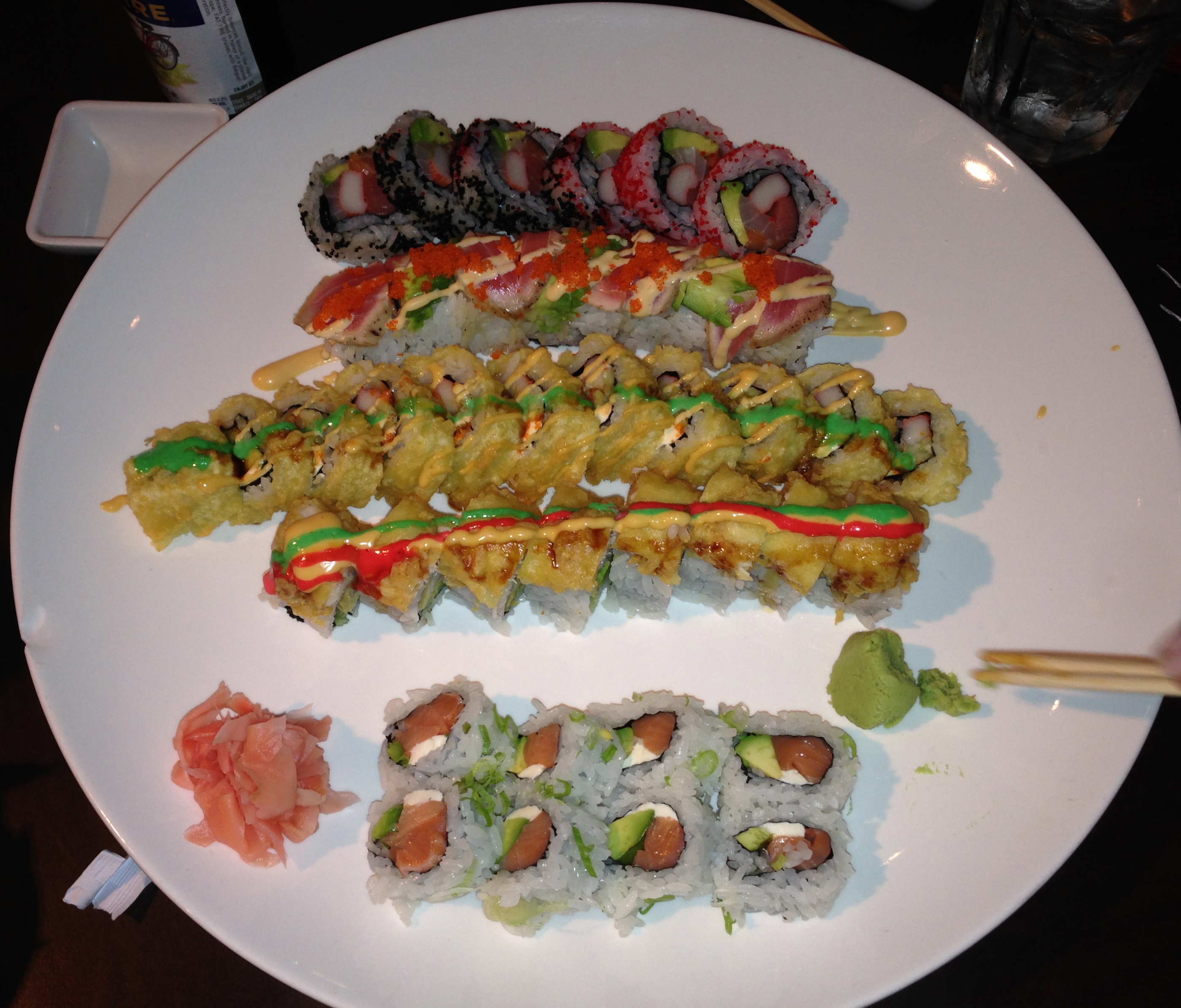 Check out this rainbow roll with large pieces of tuna, salmon, and snapper. Gorgeous. We got a roll that wasn’t on the five board.
