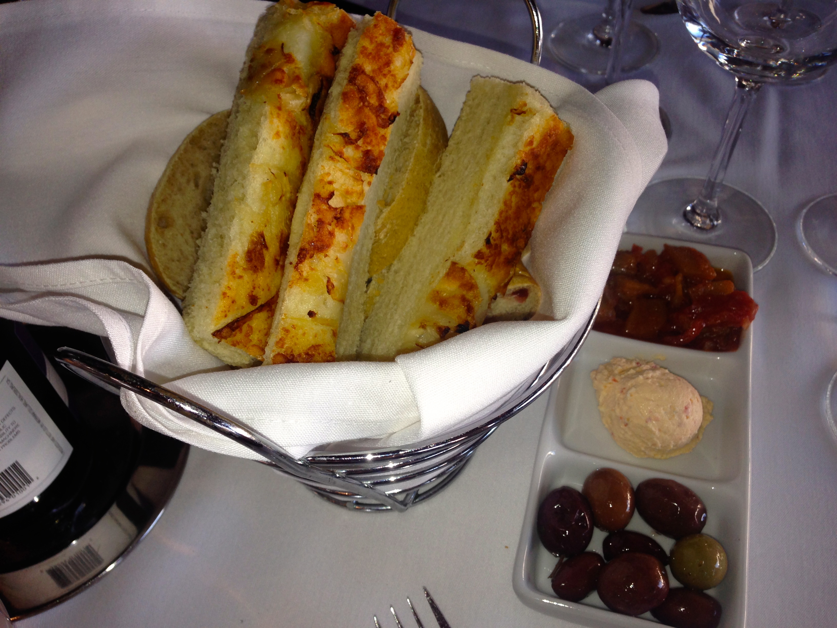 The bread on the table is fantastic, especially when we add the eggplant capenata and goat cheese pepper spread. We are not here to fill up on bread, although it would be very easy to do so.