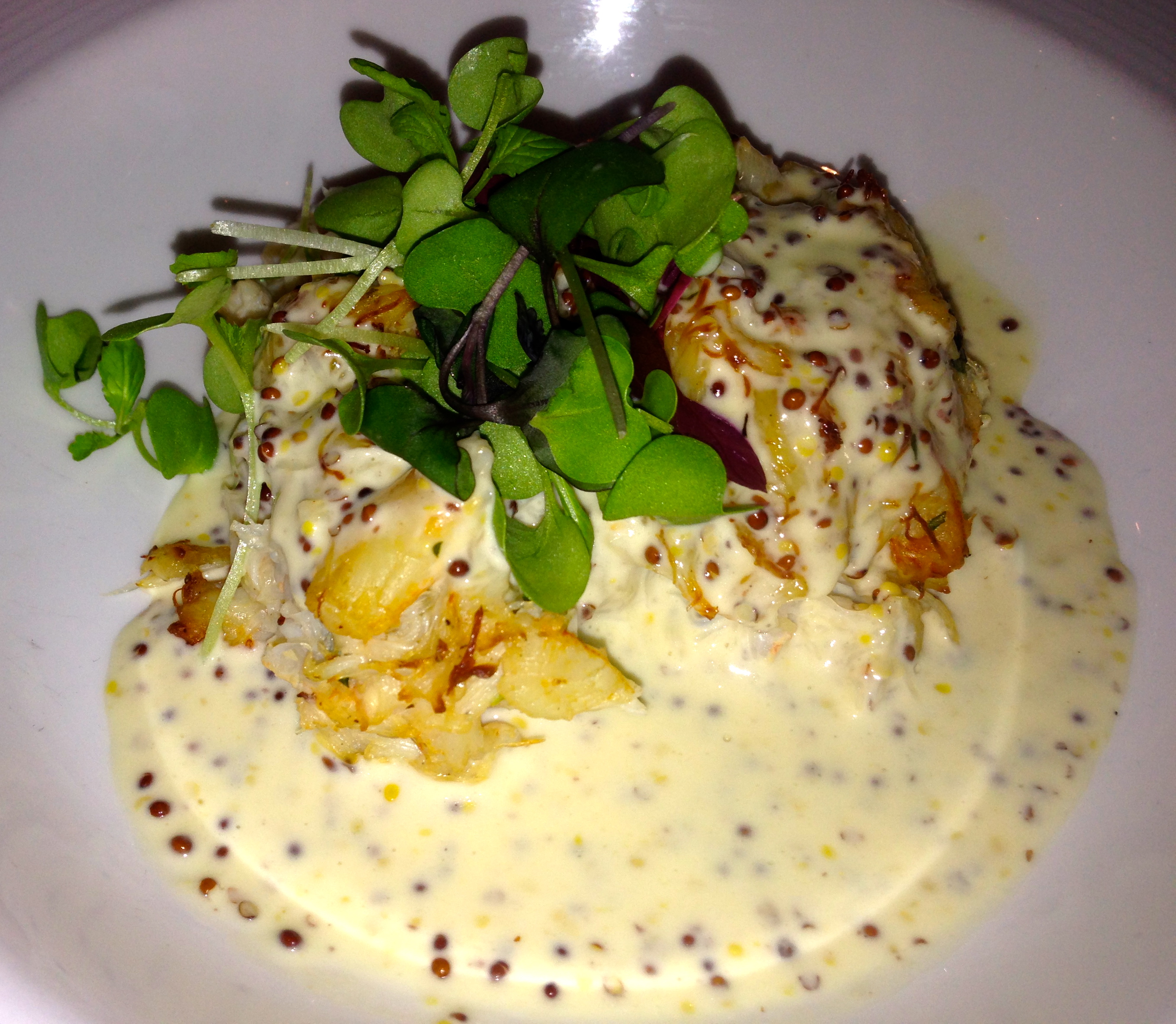 The first course is delivered to the table, the oven baked Jonah lump crab cake, which is covered in mustard sauce. There’s a lot of crab in this dish with almost nothing to hold it together. The sauce complements the crab, making this a very successful dish.