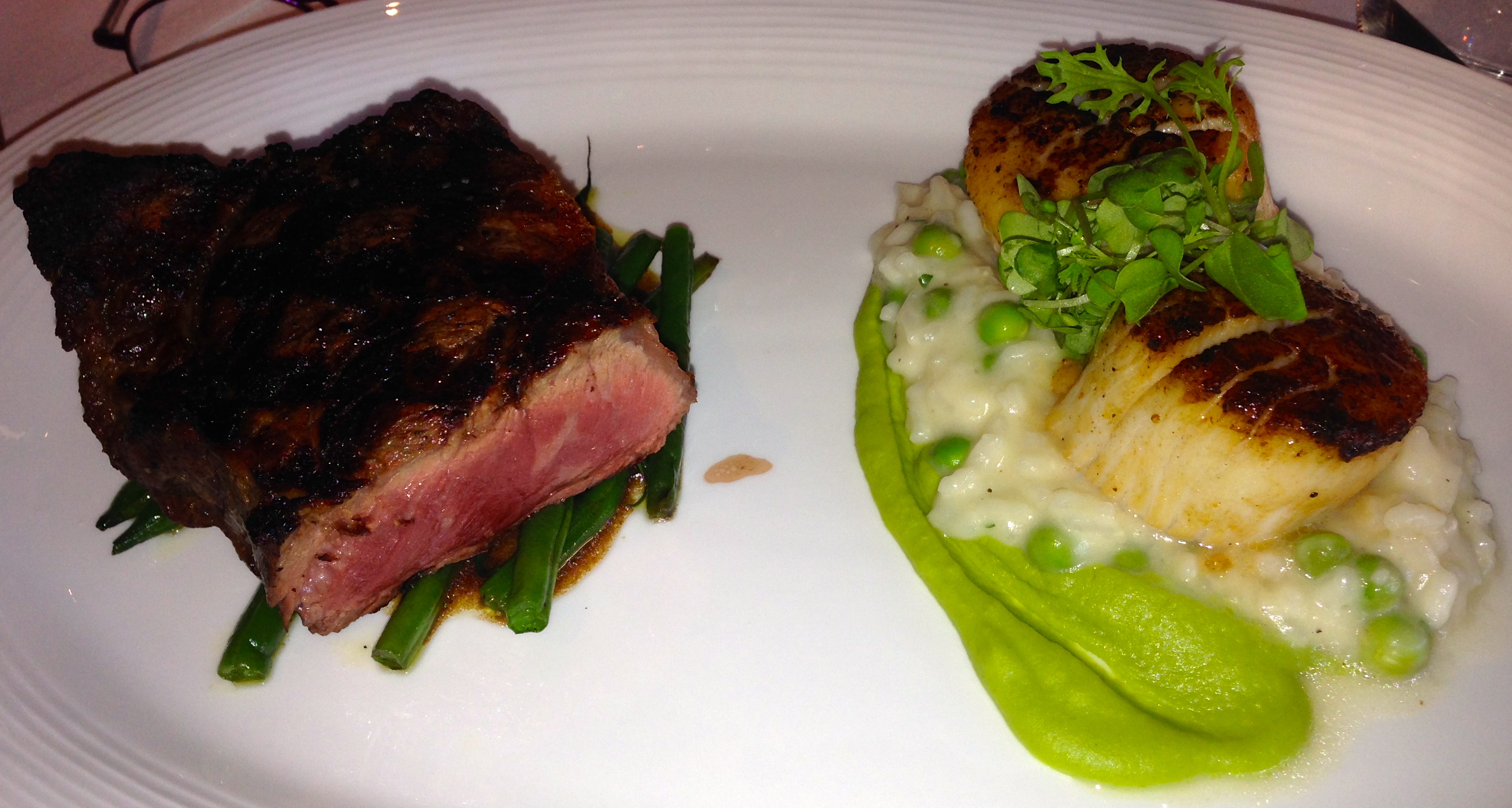 The main event is served next, a surf and turf featuring NY sirloin, scallops and pea risotto. I’m not a scallops guy, but I would become one if they were all served like this. They are huge and pan seared, which gives them a browned outer crisp while keeping them nice and juicy inside. The steak is a little on the rare side. I would have liked it cooked for 60 more seconds, but I wasn’t going to send it back. We are full, and take some home for lunch the next day, and it cooks up perfectly on the reheat.