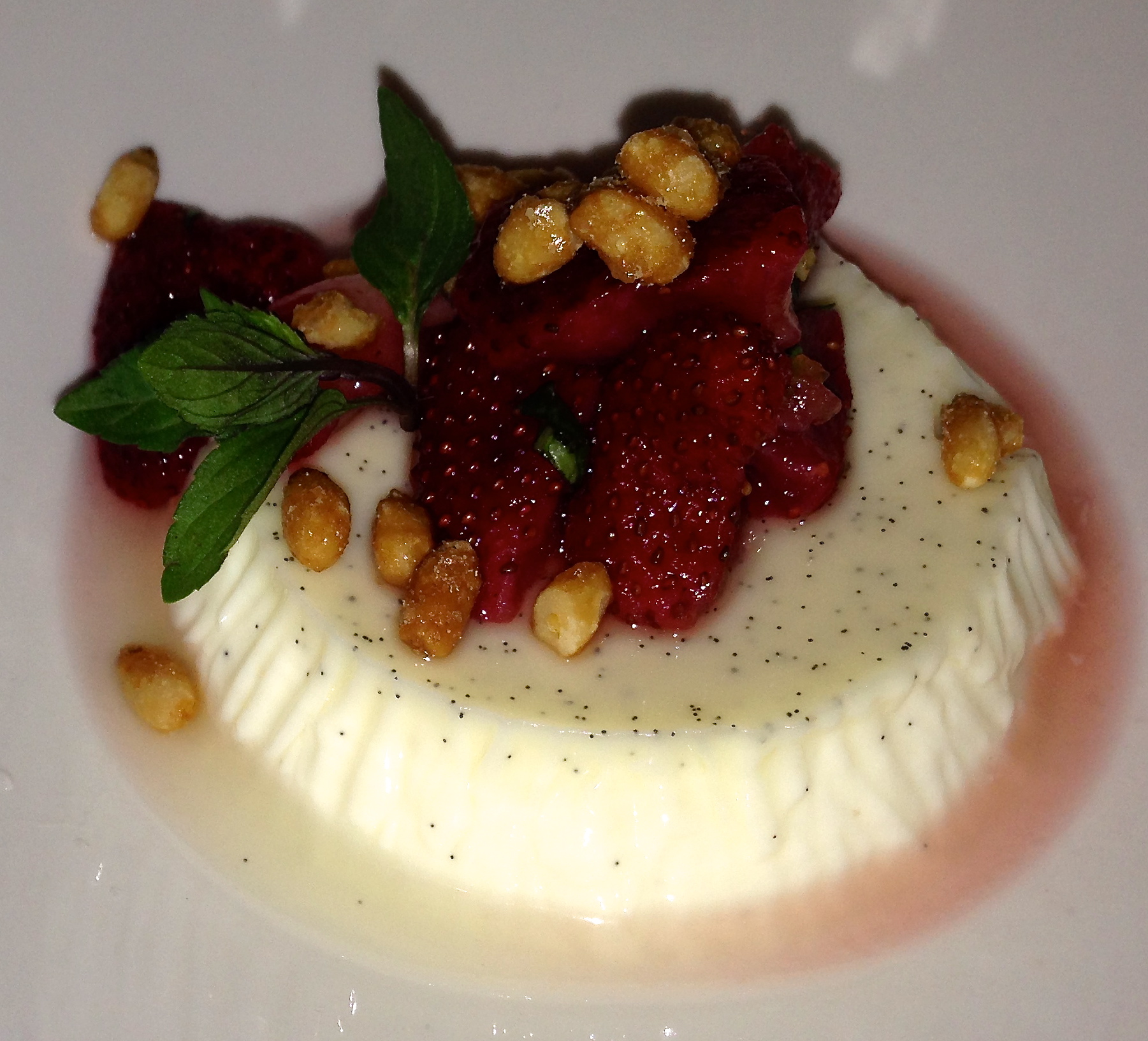 We hardly have any room left, but fortunately there’s a light dessert. The panna cotta comes with Georgia strawberries and mint on top. It’s very refreshing and a nice way to end this amazing meal.
