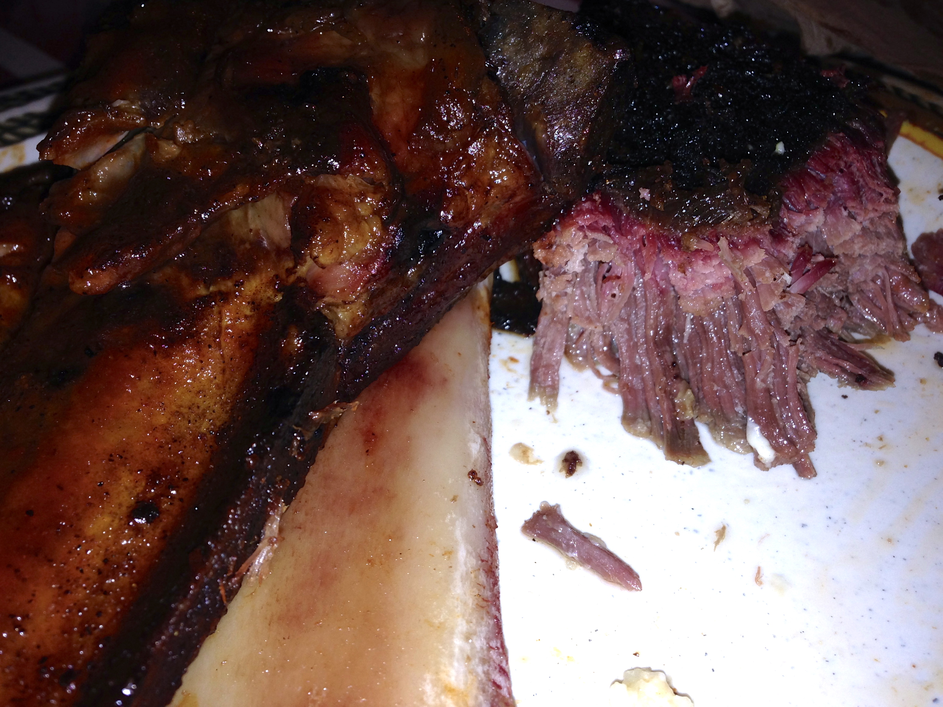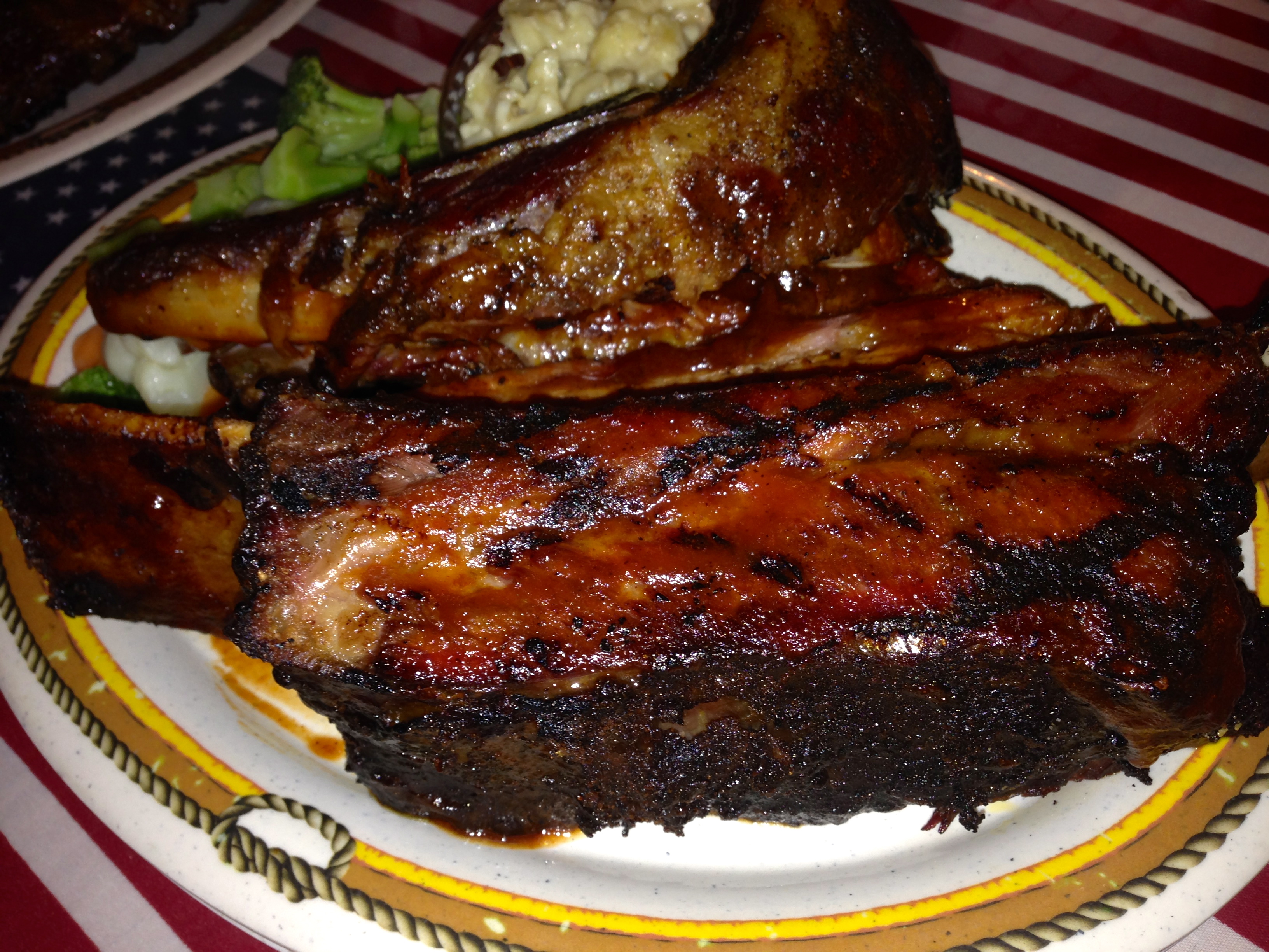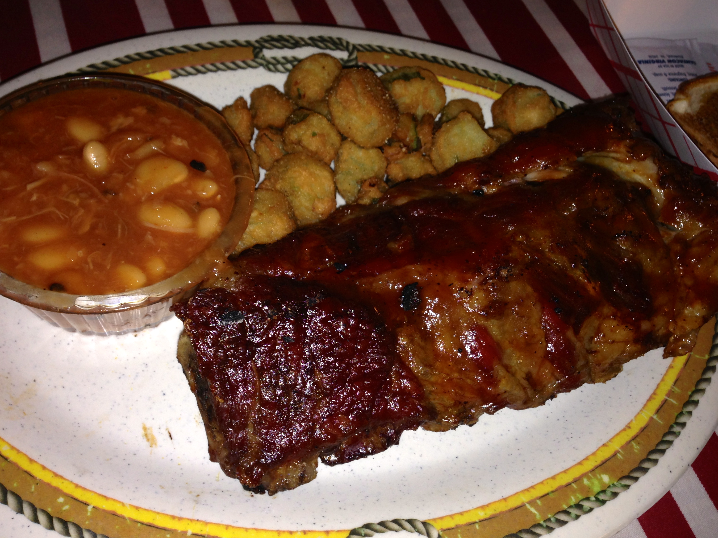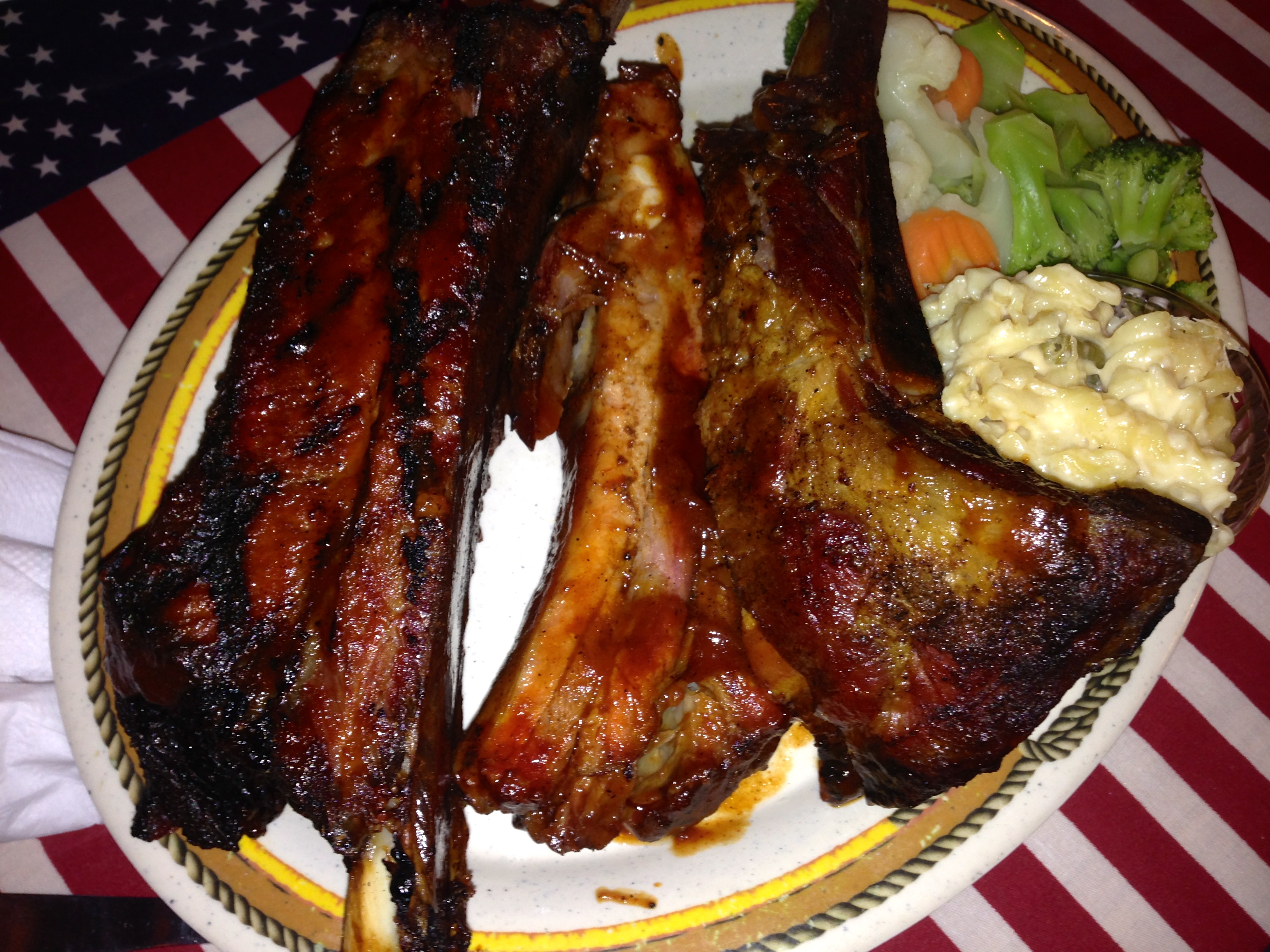 Here it is from another angle, just so you can see how big it is. And check out the size of those pork ribs. They are big and meaty too. By the way, the macaroni and cheese is excellent. There’s a lot of different cheeses in there and it’s obvious that they made it from scratch. No Kraft box mixes here. The veggie side is a bit disappointing. It tastes like frozen vegetables, but you probably shouldn’t order something green in a BBQ joint in the first place.