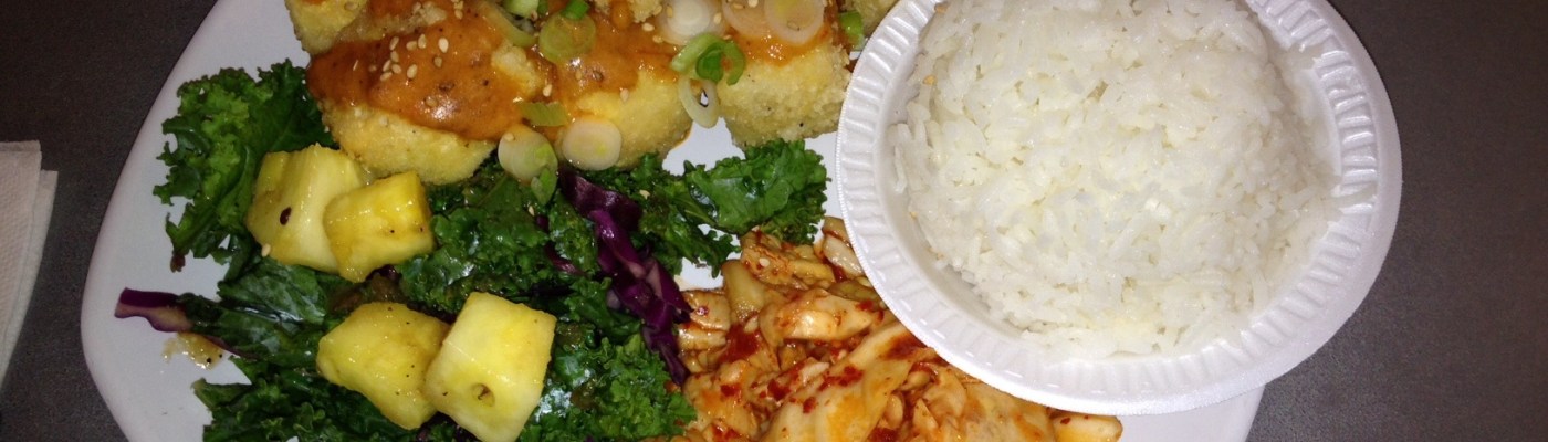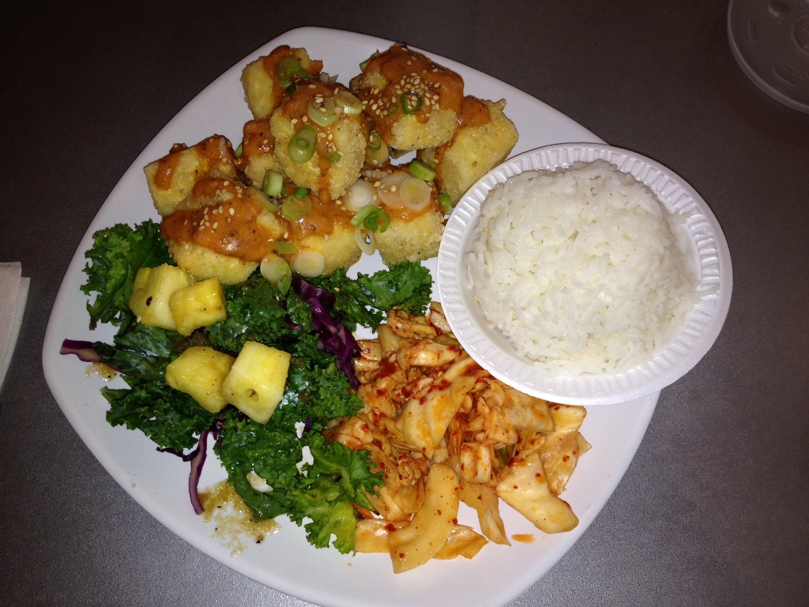 I choose the Crispy Tofu. It comes with a kale/pineapple salad, cabbage “kimchi” and white rice. The tofu is fresh and crispy as advertised, there is a special sauce on top which adds just the right amount of heat and flavor. The spicy slaw is so hot that I am unable to put the fire out with the white rice and I only eat one bite. Admittedly, I am a hot sauce wimp but this slaw is really HOT and my eyes are watering.