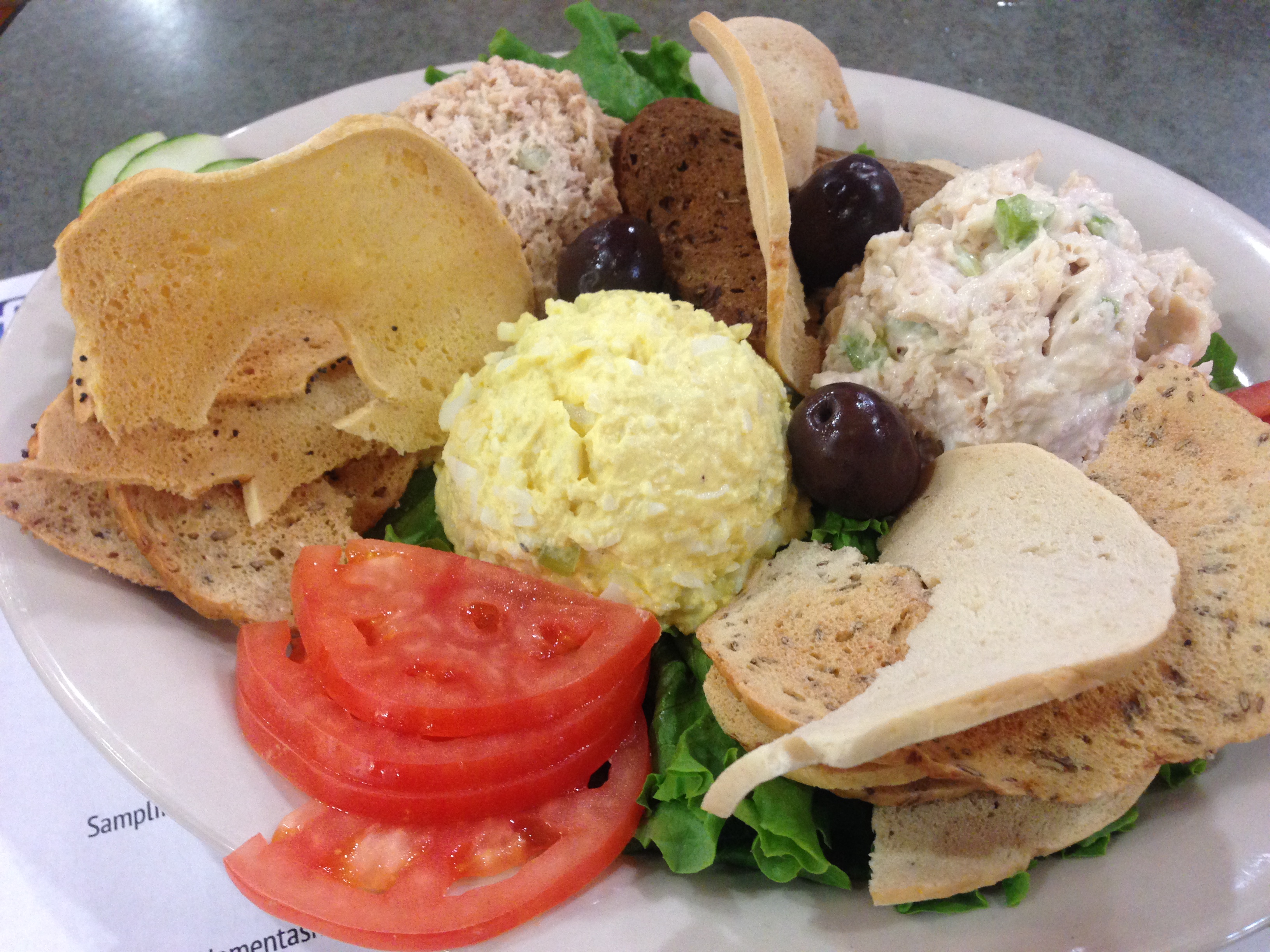Here’s an assortment of their salads, served with fresh, crunchy bagel chips. Egg salad, tuna salad and chicken salad are fresh and creamy. And best of all, there are no onions.