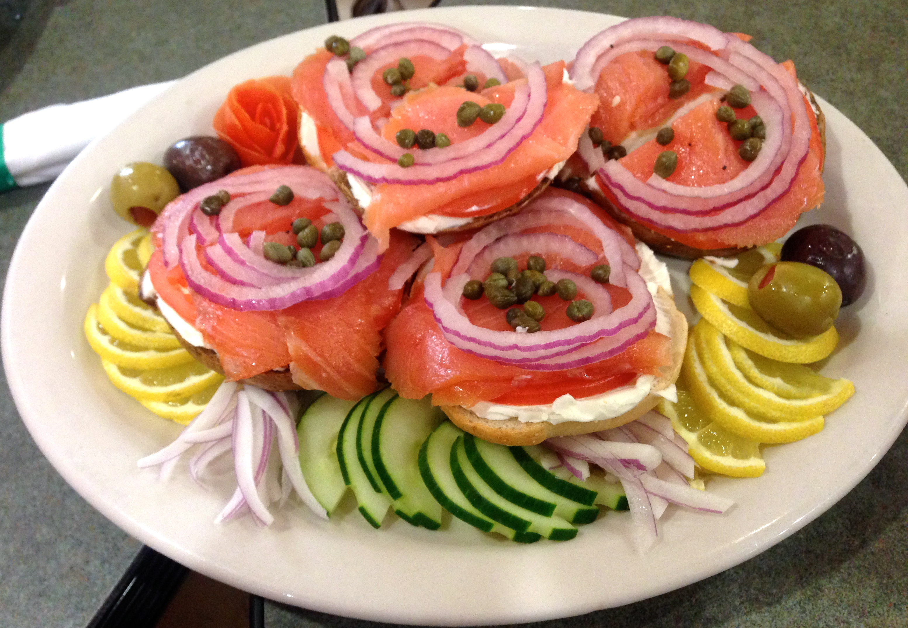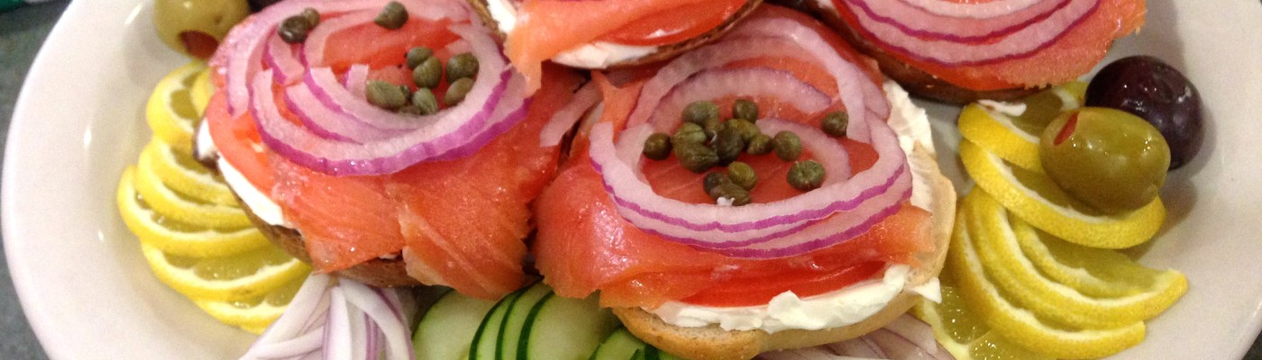 There’s nothing better than nova salmon and cream cheese on a fresh bagel. It’s simple, it’s delicious, and nothing says “deli” like this dish. Aaron flies his smoked fish in from New York and we are glad that he does.