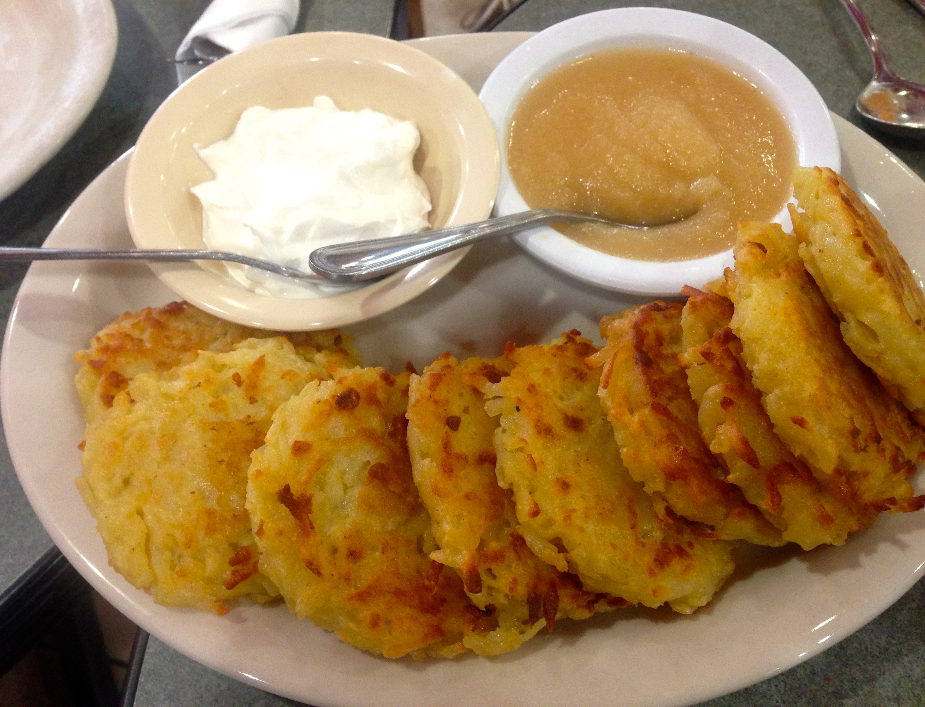 Potato latkes come with sour cream and applesauce. Creamier than the latkes Eve makes once a year, they are like eating the center of a knish.