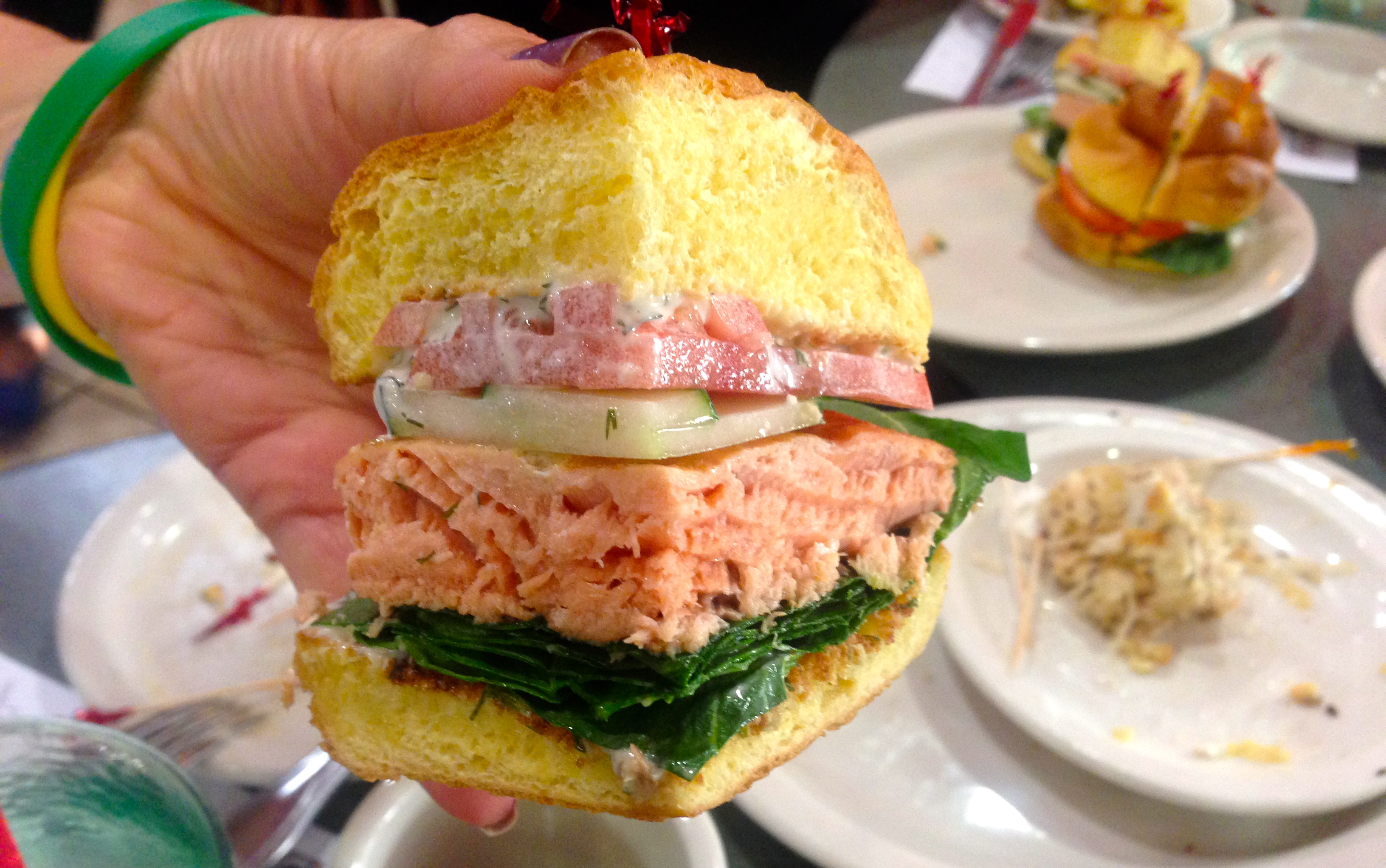 Burgers are a recent addition to the Goldberg’s menu. The salmon burger is a whole piece of salmon, not a chopped up salmon patty. It comes with a nice dill sauce on that great challah bun.