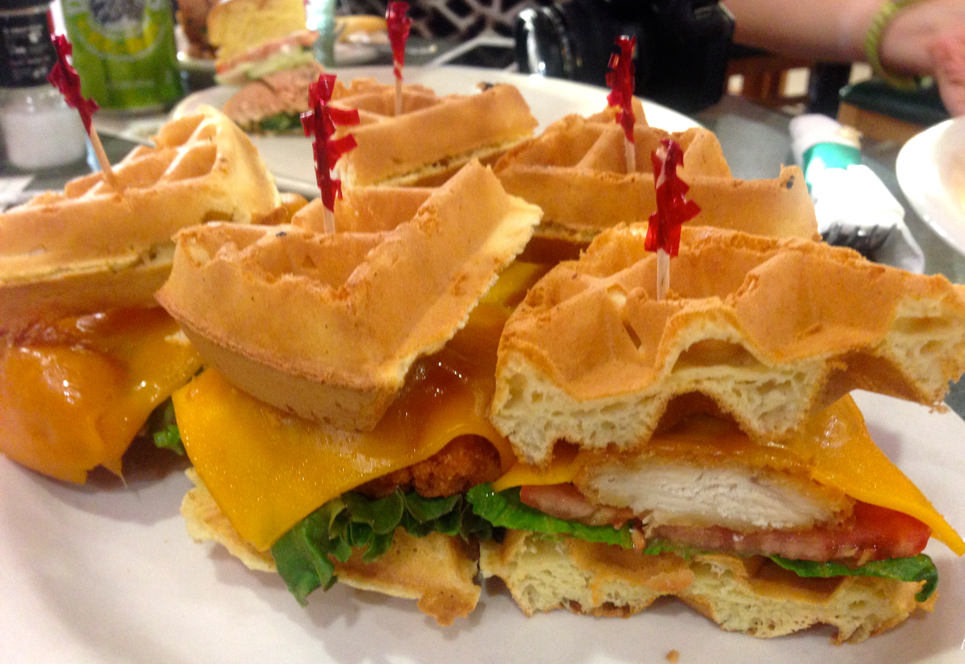 The chicken and waffle burger is just so-so. The crispy waffle has cheese, lettuce and tomato with the chicken. We would like it better if they ditch the cheese and veggies and just drown the whole thing in maple syrup.