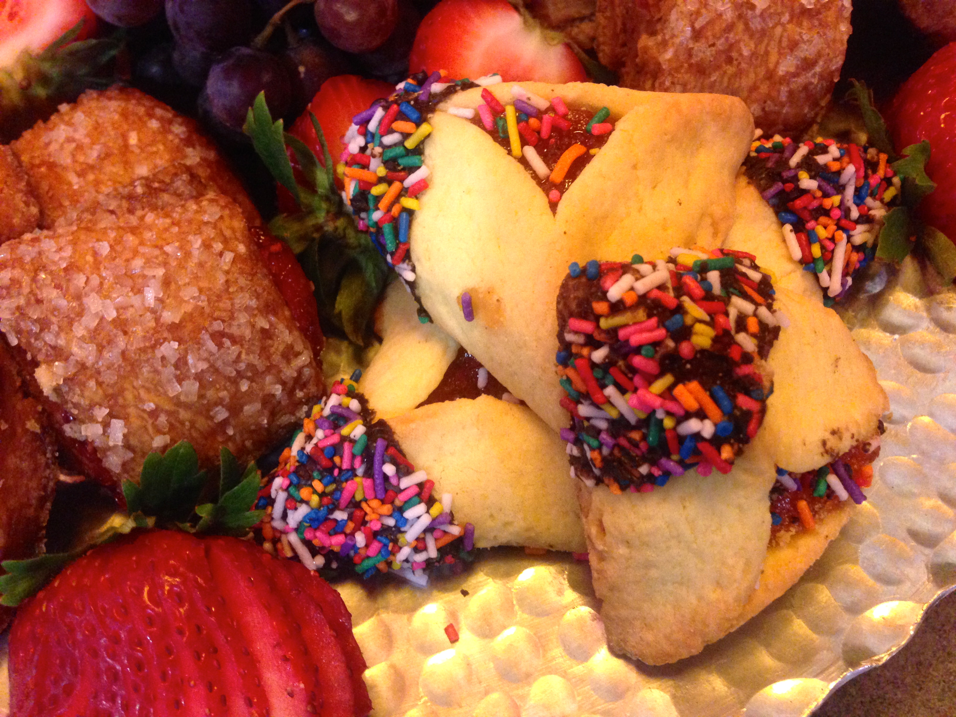 Evidently, hamentashen is not just for Purim any more. It’s even better dipped in chocolate with the sprinkles.