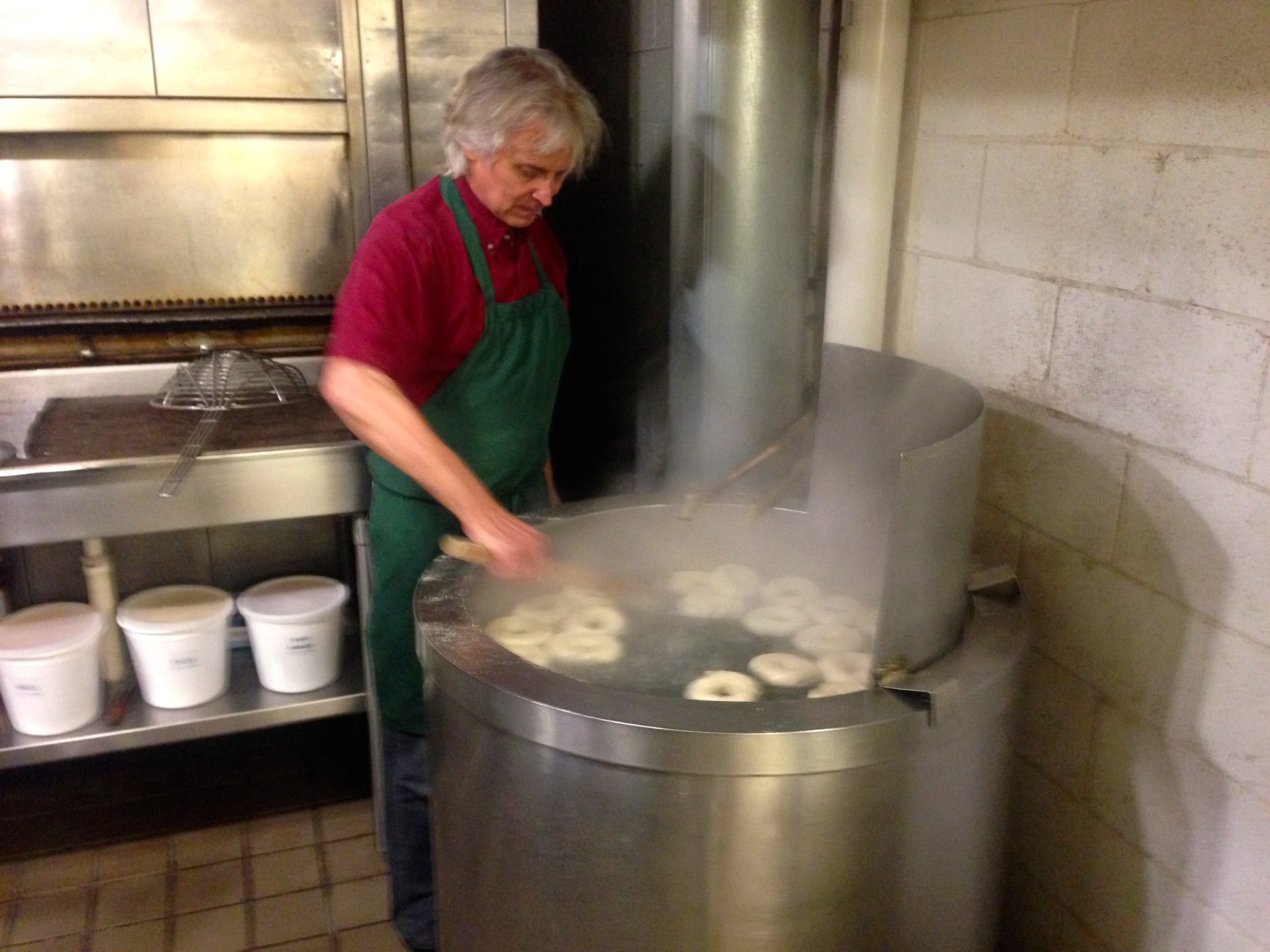 After the meal, we go back to the kitchen to see how bagels are made. They make 54,000 of them here each week. That’s 4-5 tons of hight-gluten flour in case you are keeping track. None of that gluten-free cooking here!