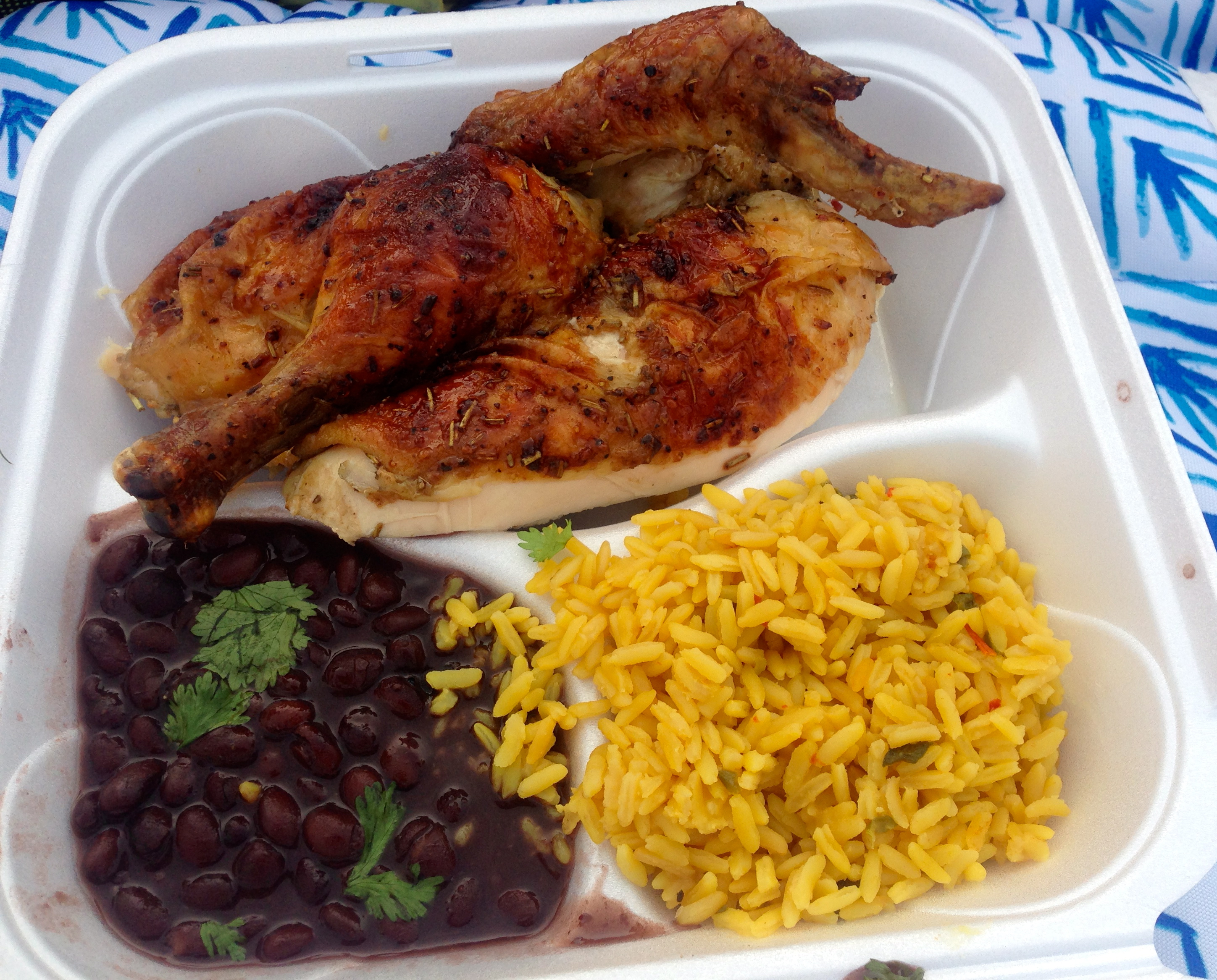Randy snags the last rotisserie chicken dinner. He gets half a chicken, beans and rice for $9.50. As you will see, this is a deal.