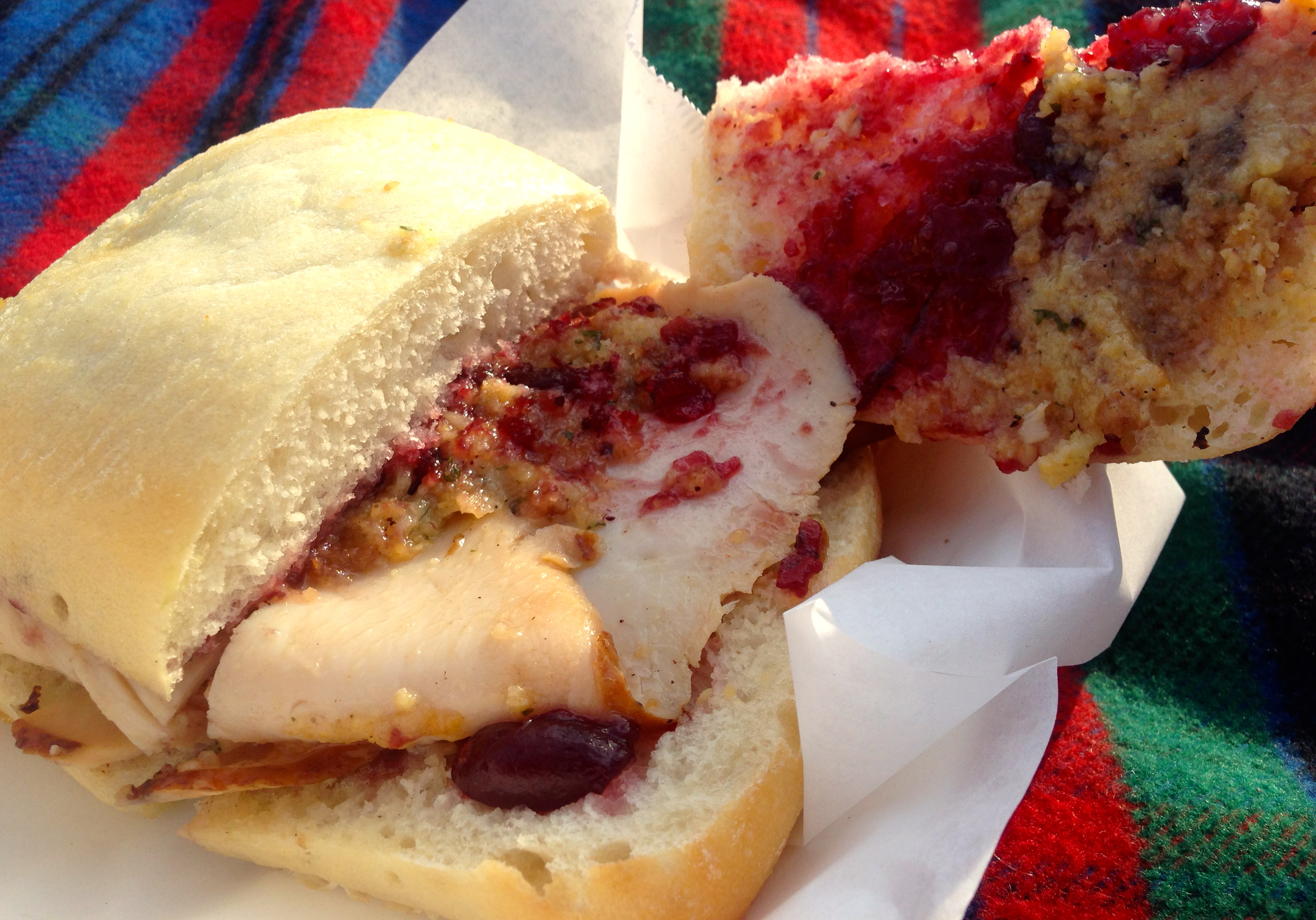 We split the turkey sandwich (also $8.50). It’s got stuffing and cranberries and tastes like Thanksgiving on a bun. This is an excellent sandwich that you should try if this truck is in your area.