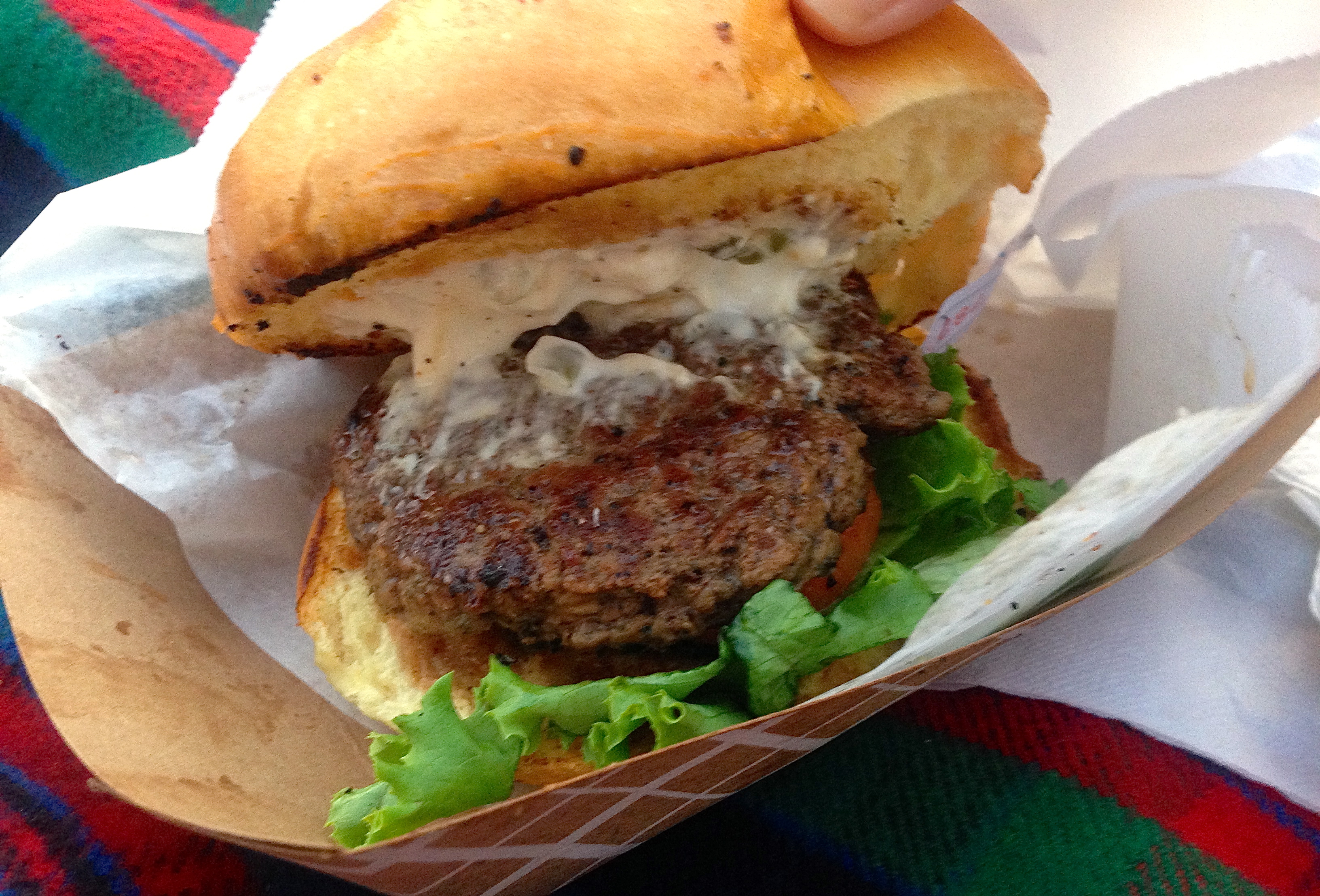 We spend $9 at Happy Belly, which means the two of us get a half a sandwich and split two sides for about $18. That’s a cheap dinner for us, but our son Elliott shows up a little later and orders a lamb burger from Mixed Up.