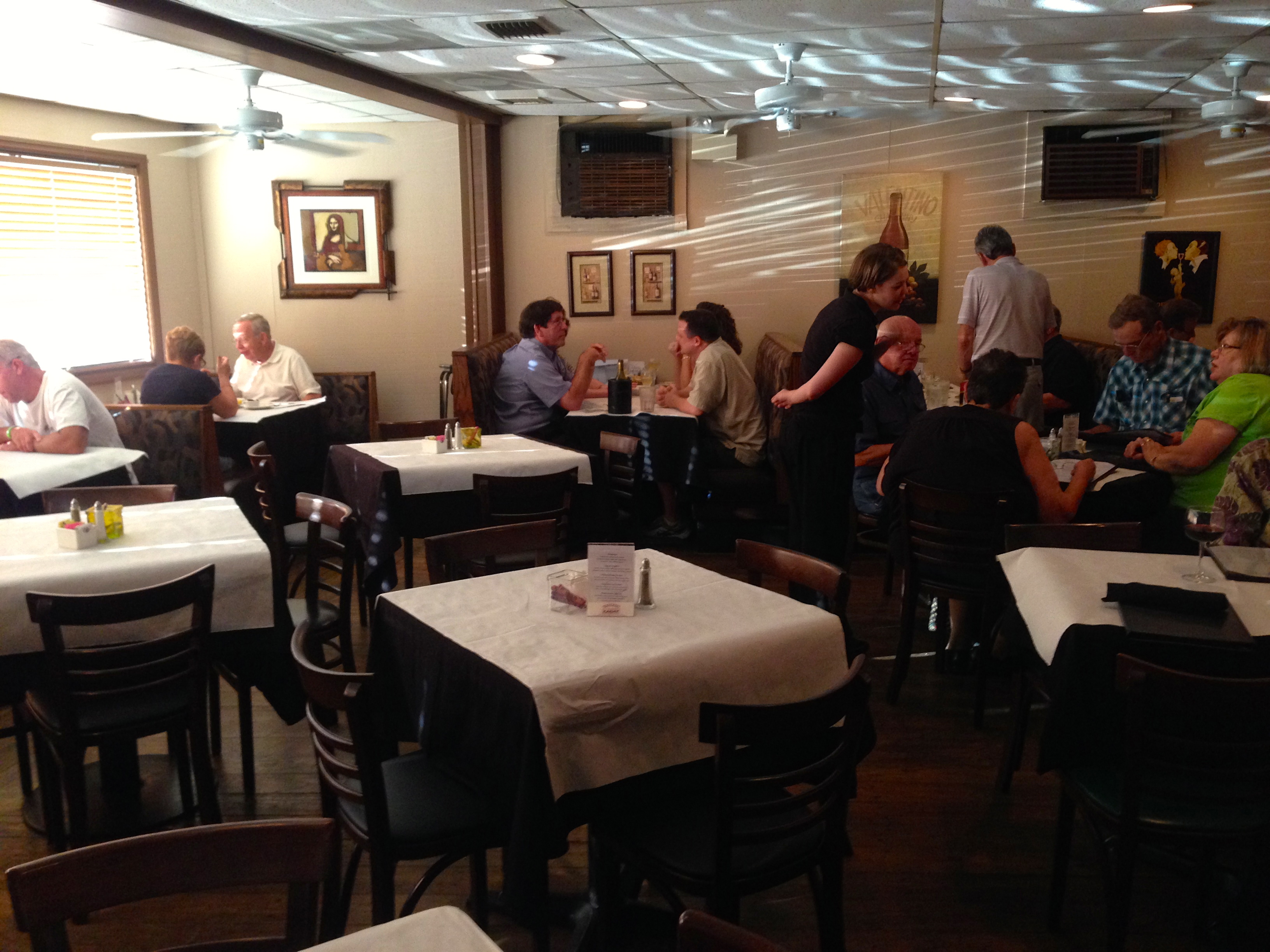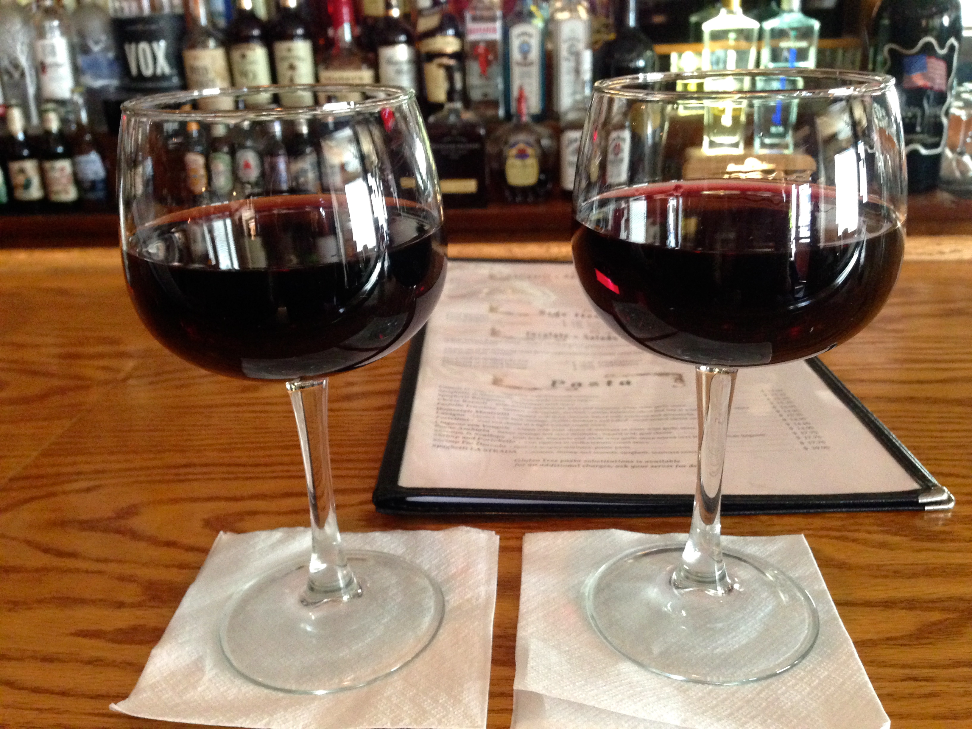 We are meeting our solo offspring for dinner, and while he sits in traffic, we sit at the bar and have a glass of wine. Like many Italian restaurants, the craft beer revolution has passed by here and the beer list is, shall we say, uninspiring. The Italian wines are plentiful and we have a glass of Chianti and a glass of Montelpulciano. Both are good reds that will go nicely with our meal ahead.