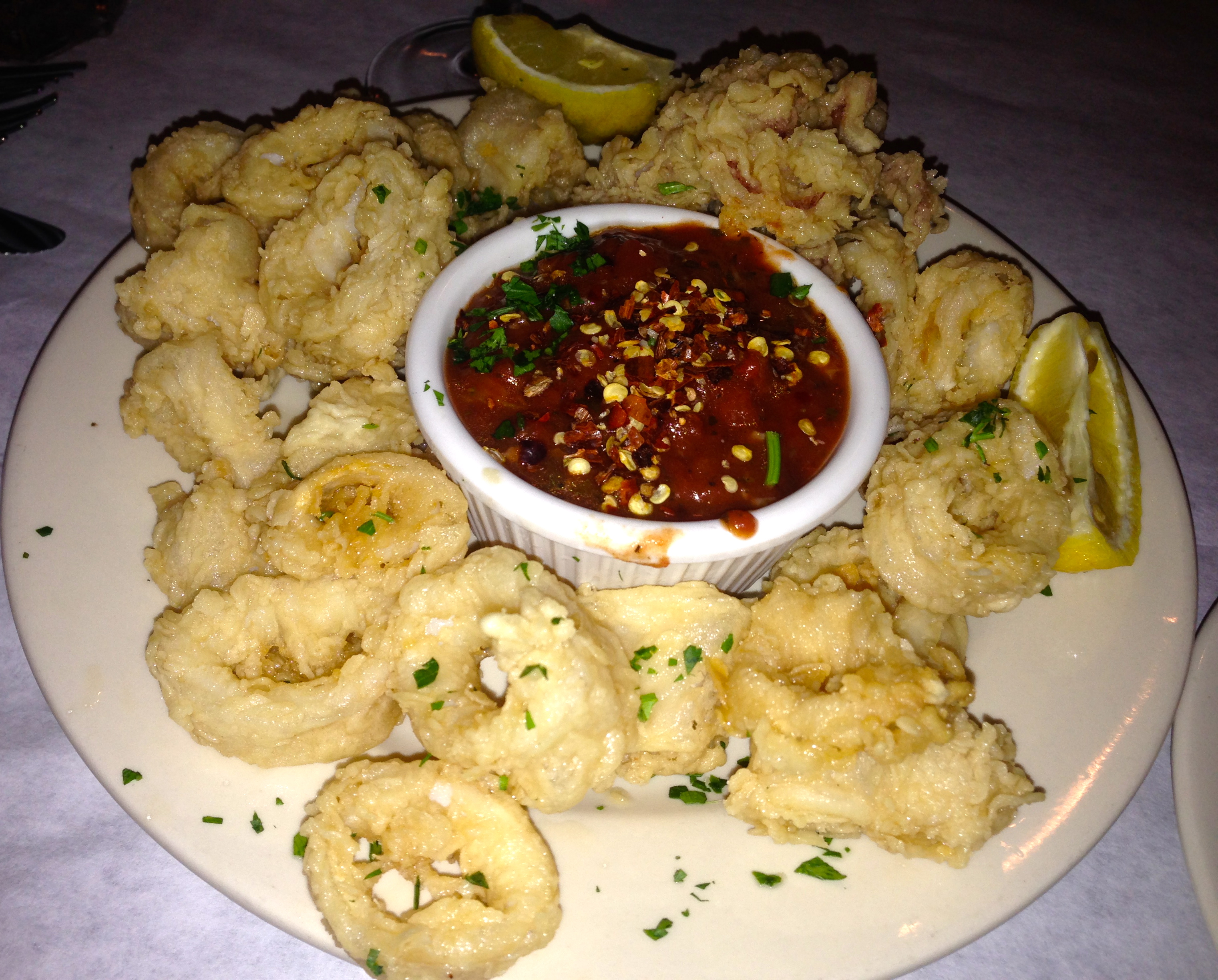 We already know what we are having for dinner, but we are hungry. Before the main event, we order the calamari. The breading is light and they know how to cook this here. How do they keep it from becoming greasy? We can barely tell these are fried.
