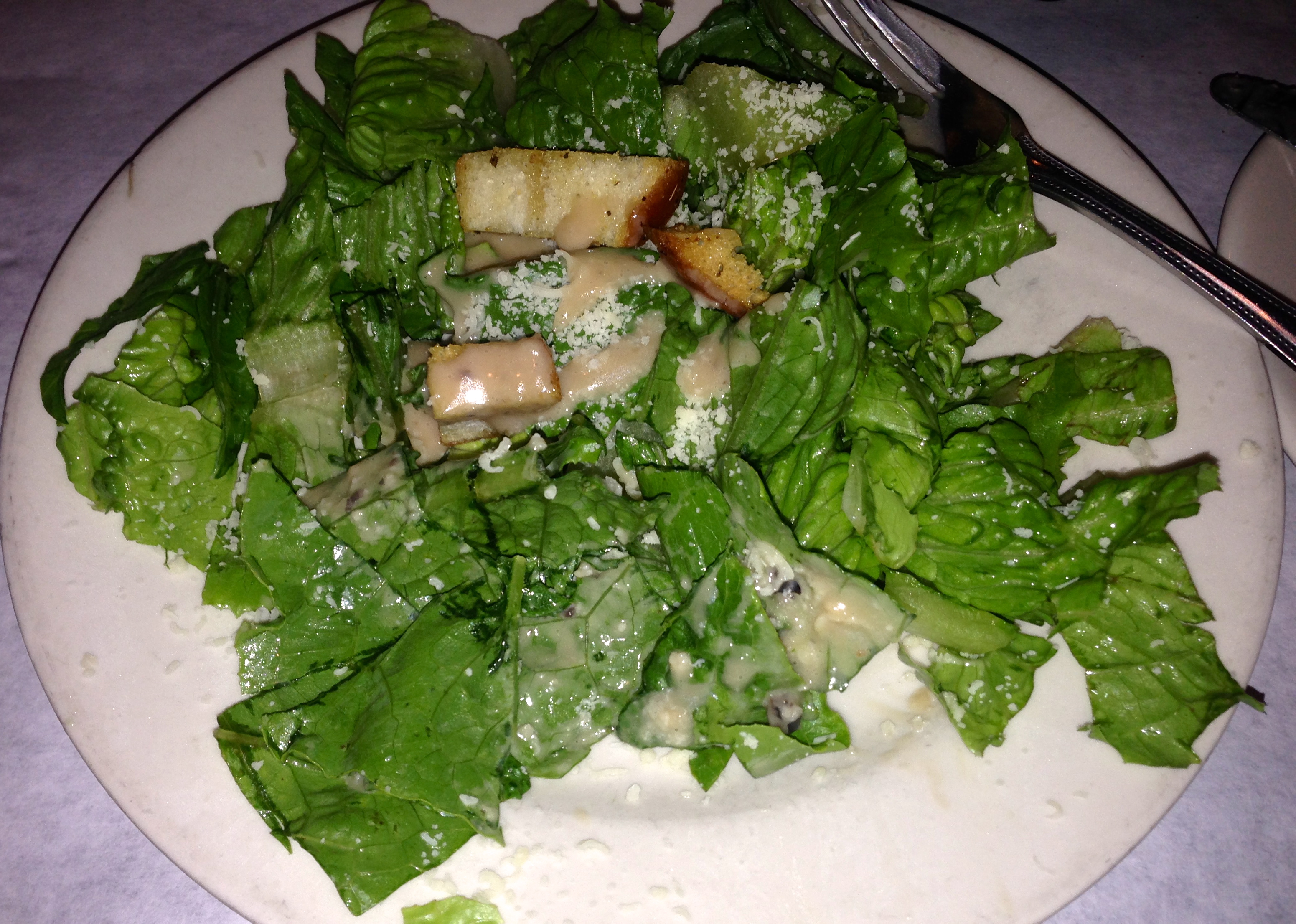 You also get a salad, with either Caesar or gorgonzola dressing. We get our Caesar on the side because restaurants tend to drown their salads in the dressing.