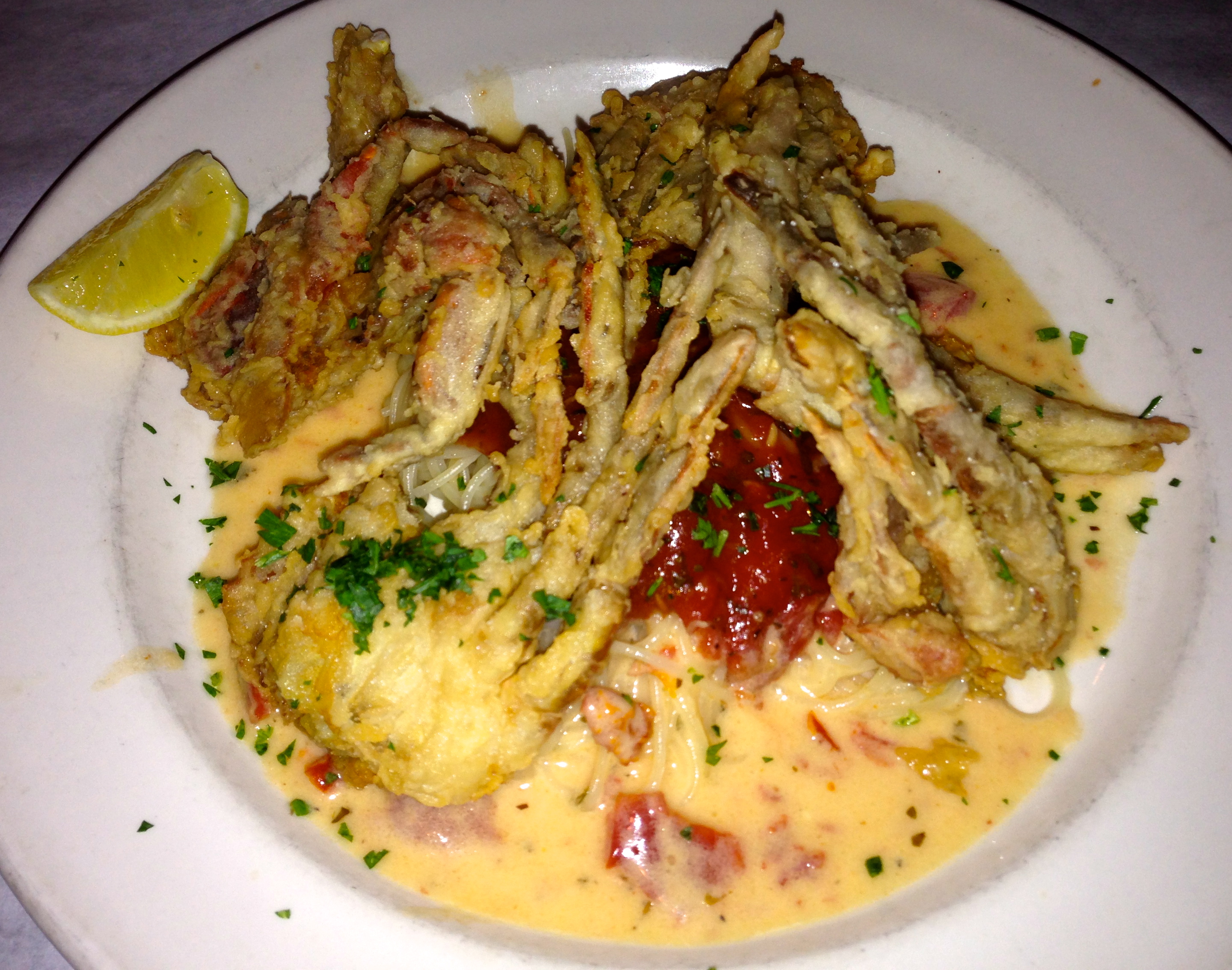 Eve and Elliott both order the crabs. They come over a bed of angel hair pasta. The crabs are cooked the same as the calamari. The breading is barely there and the light tomato sauce goes perfect with both the seafood and the pasta.