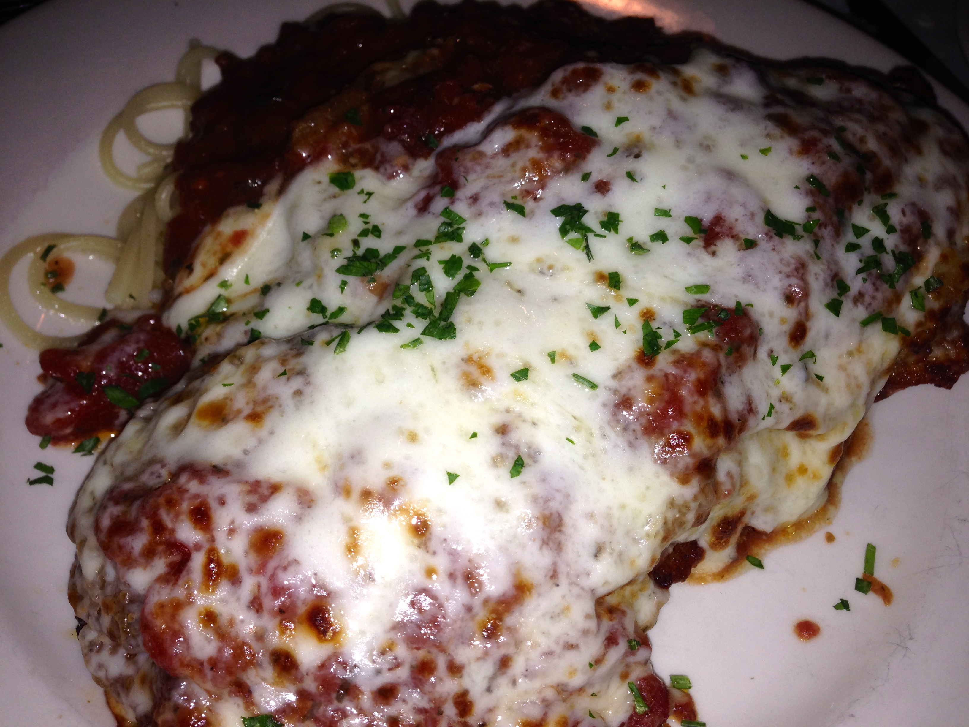 I want the crabs, but if we all get the same thing, we won’t have a lot to write about. Fortunately, Eve promises to share hers. In the spirit of good journalism, I order the stuffed chicken parmigiano. It’s more layered than stuffed, with eggplant and prosciutto hiding under all of that cheese. The huge chicken breast and the side of spaghetti makes this a large, filling, delicious dish. Although we all share, some of this comes home for a future meal.