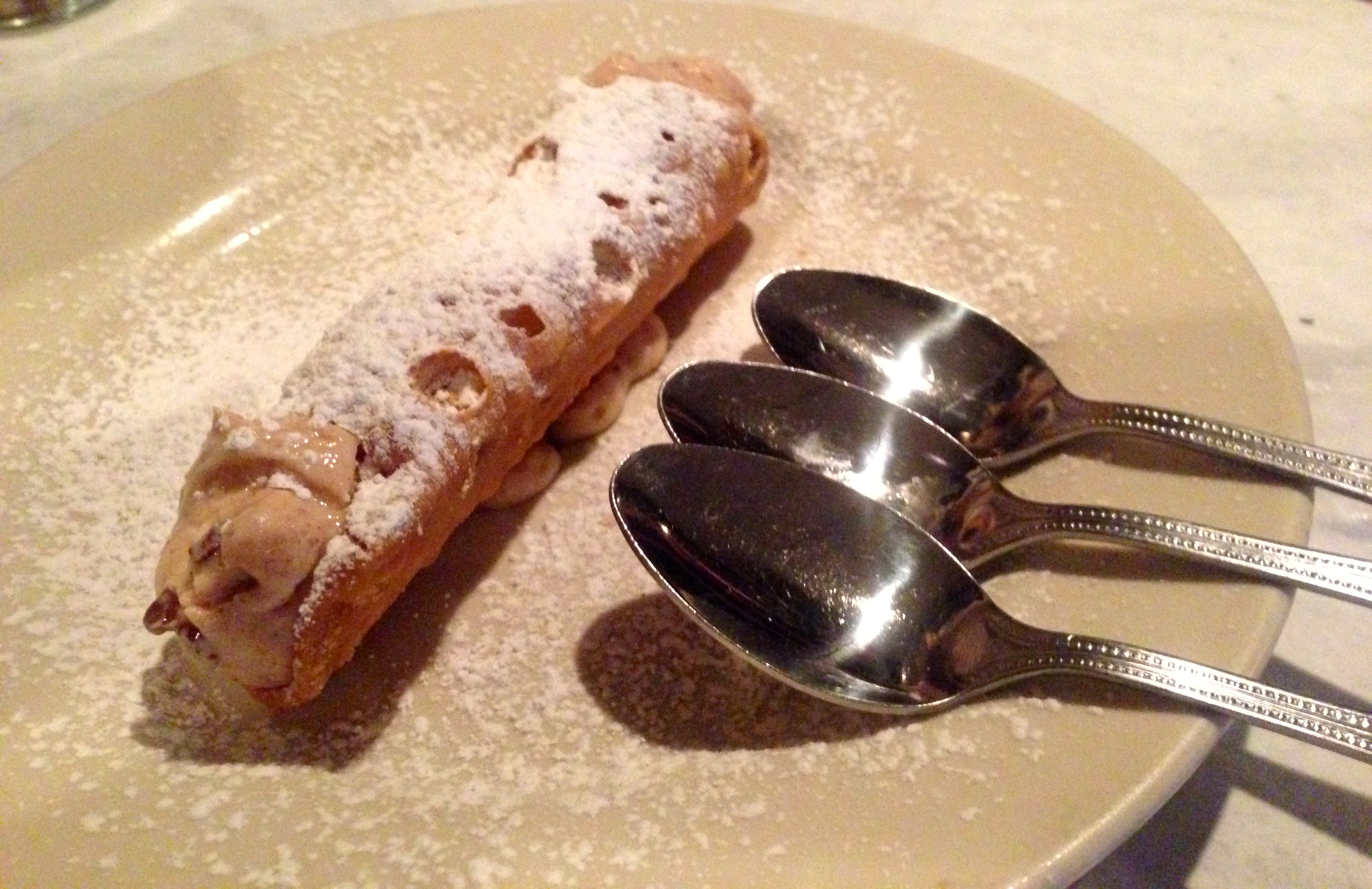 I’m not sure how we have room for dessert, but we decide on the the cannoli. It’s light and full of cinnamon and chocolate chips. Evidently, it’s made from grandma’s recipe and it gives a sweet ending for three very full diners.