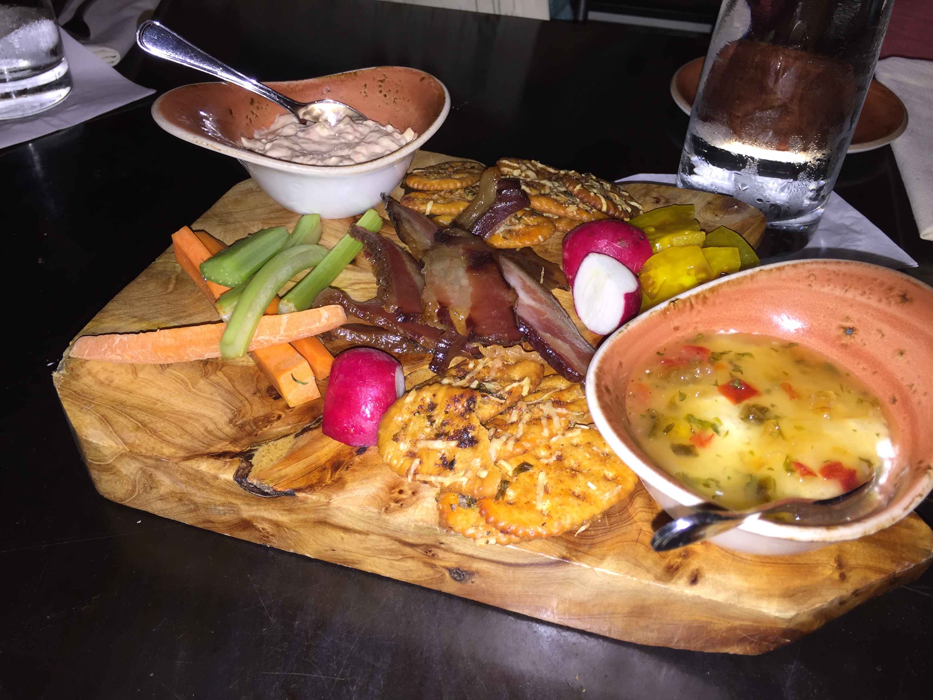 Isn’t our last appetizer pretty? The southern picnic board features bacon, pimento cheese, cream cheese with pepper jelly, veggies and crackers. It doesn’t get much more southern than this. My favorite part is the bacon, but guys seem to like as much bacon as possible.