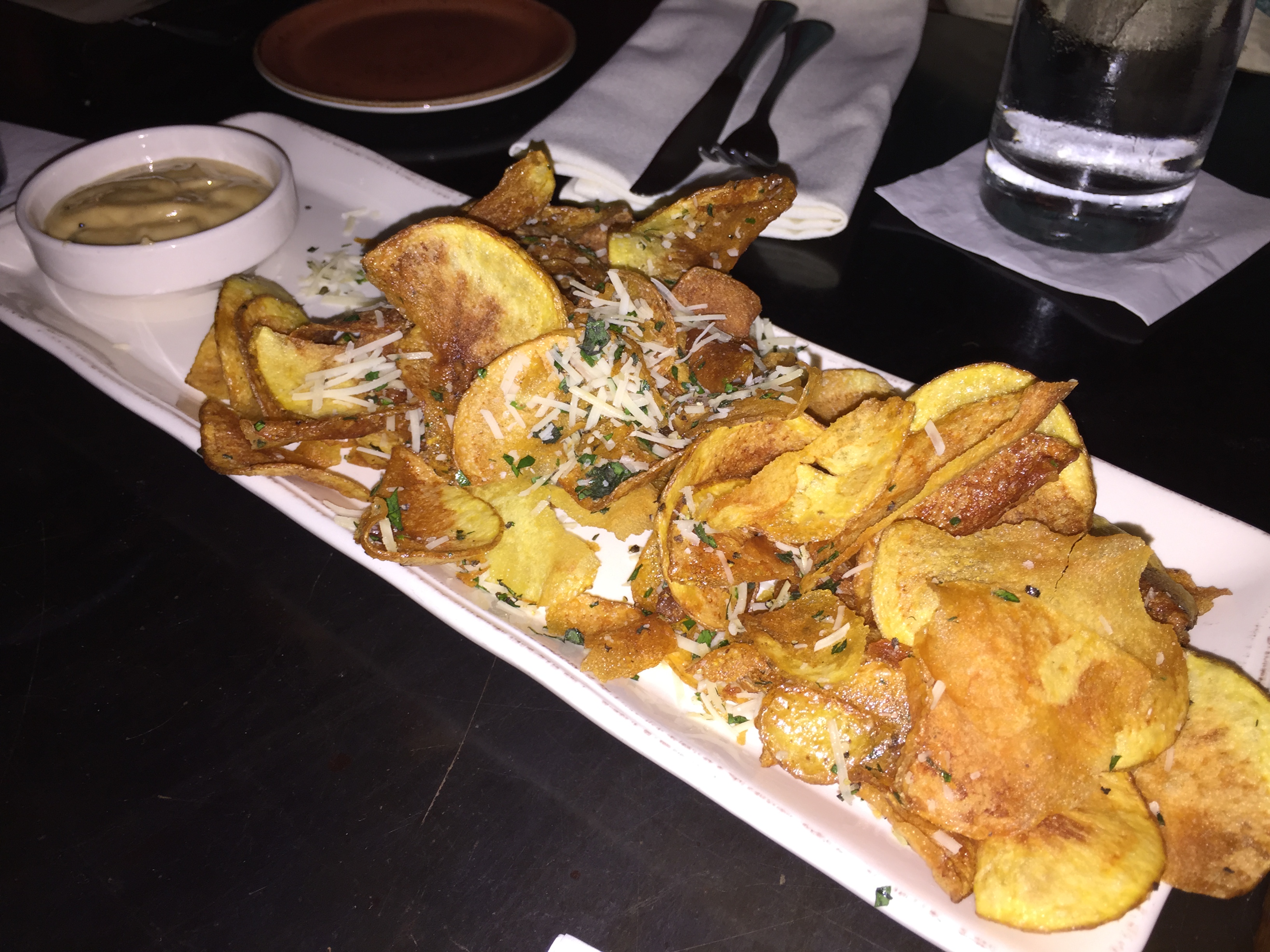 Let’s start with the House Chips. Thinly-sliced Yukon gold potatoes are fried and seasoned. Simple, yet crunchy and delicious.