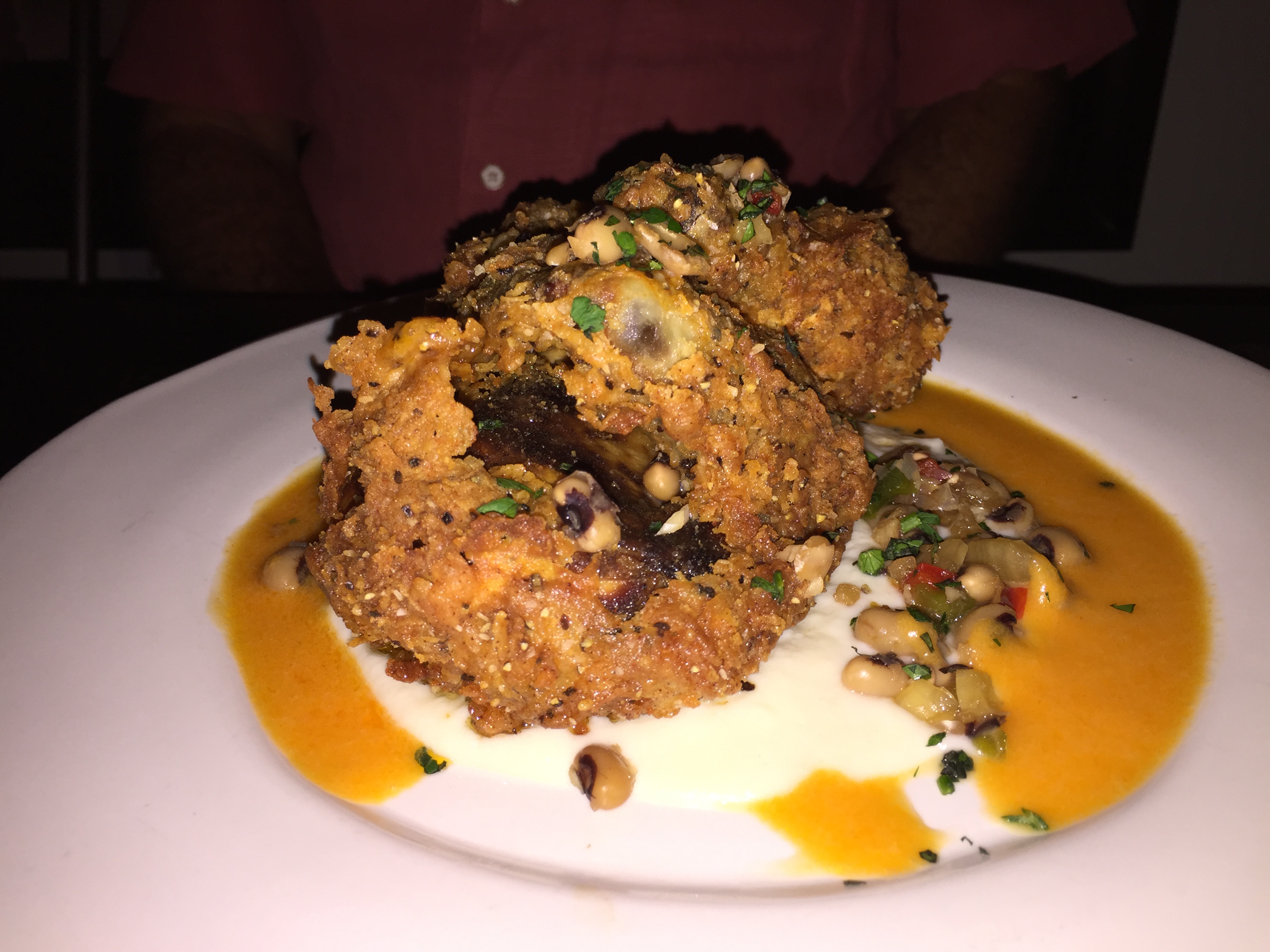Here’s the star of the night, the smoked fried chicken, of which I am lucky enough to get a piece. Did I mention that it’s my birthday? They start it in the smoker and finish it in the fryer. You get the best of both worlds: smoky chicken inside and crispy skin on the outside. This is one amazing plate of fried chicken, well worth the calories. Don’t miss this when you go.