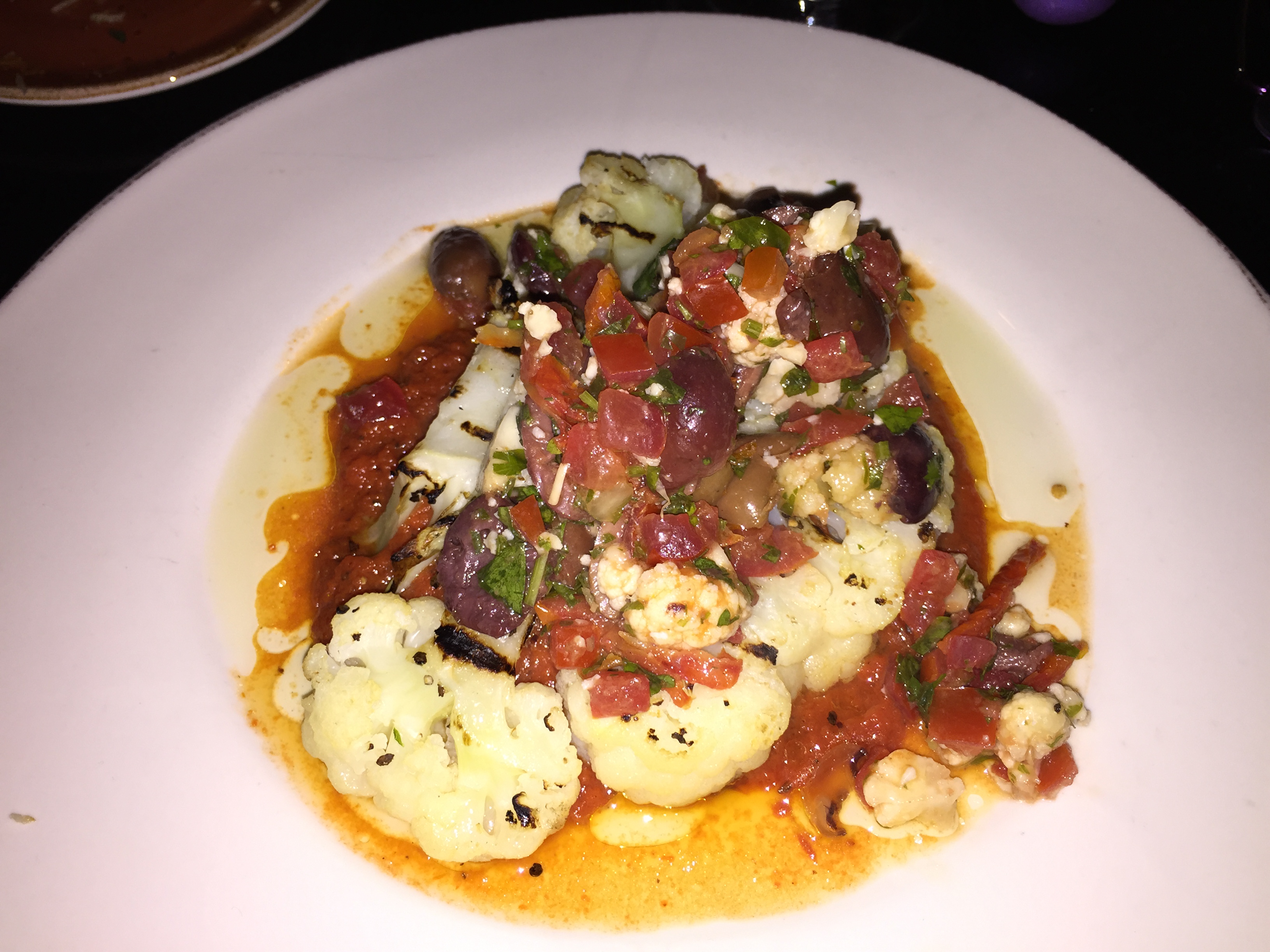 Eve gets another vegetarian dish, the grilled cauliflower. It comes with tapenade and a tomato ragu. This is an interesting combination of taste sensations and ingredients. The cauliflower has just a little crunch. You probably would not combine these ingredients at home, but this dish works.