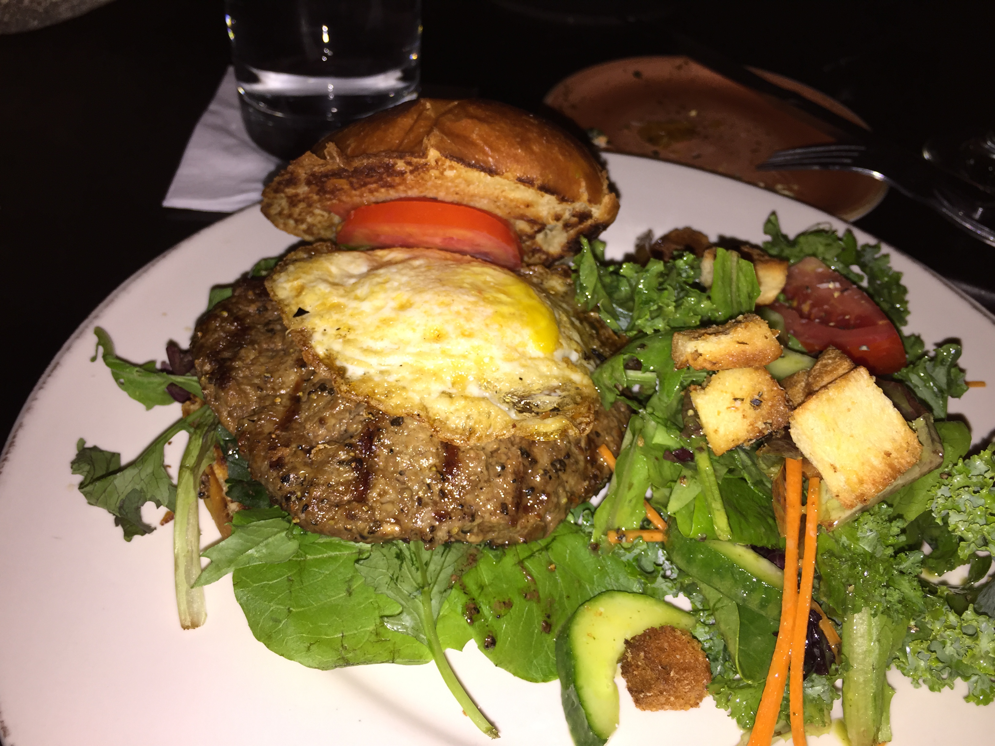 My dinner is something else that really works, the burger. That’s what it’s called on the menu, just “the burger”, and I add the optional fried egg because it is my birthday. You can pair it with the house chips, but we ordered those as an appetizer, so I go healthy with a salad. This is one of the best burgers I have had in a long time. The Brasstown Beef is so good and this burger is so fresh.
