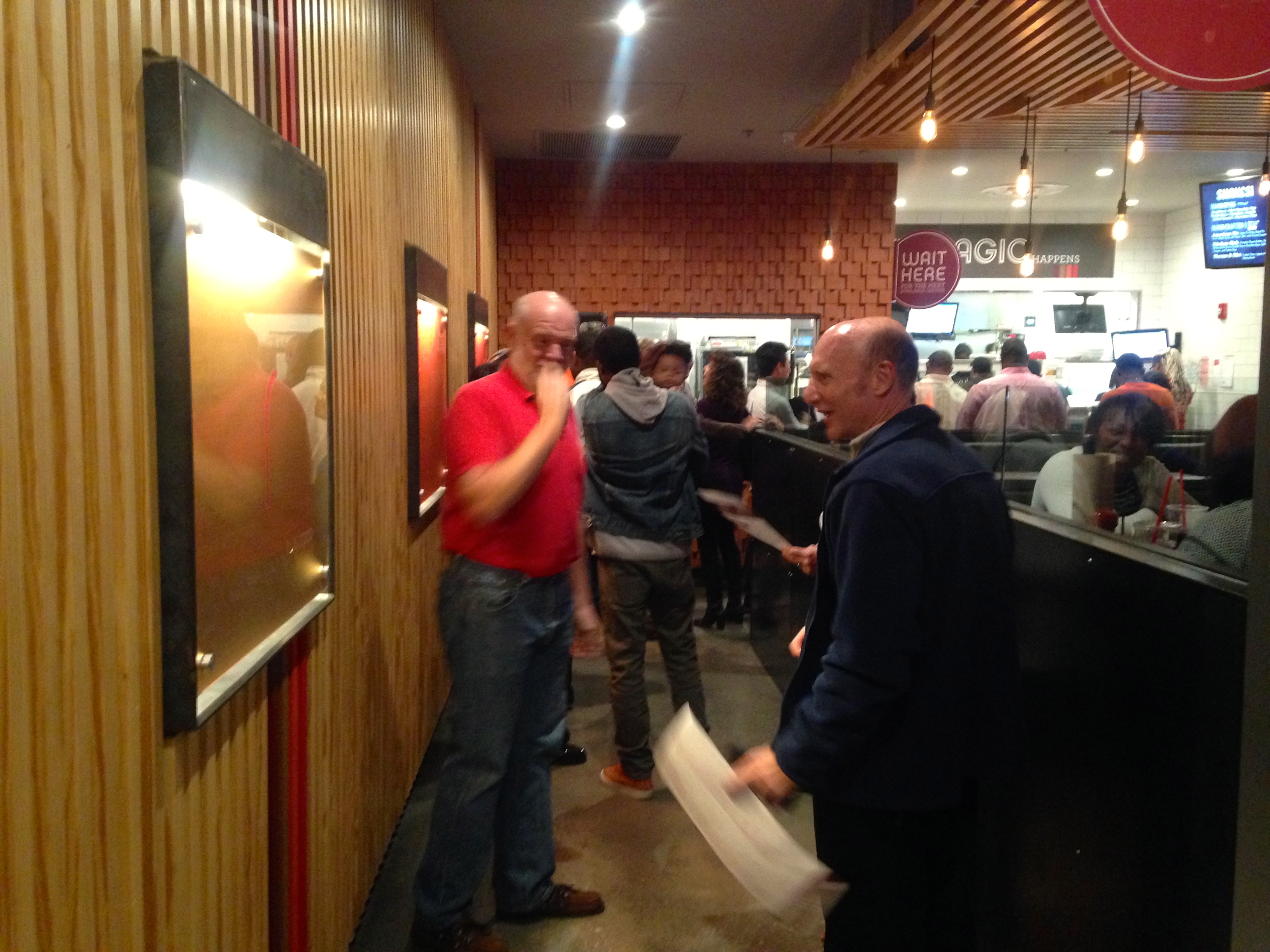 There is a big bar to the right when you walk in. You may want to pick up a beer, because the next thing you do is wait in a line.