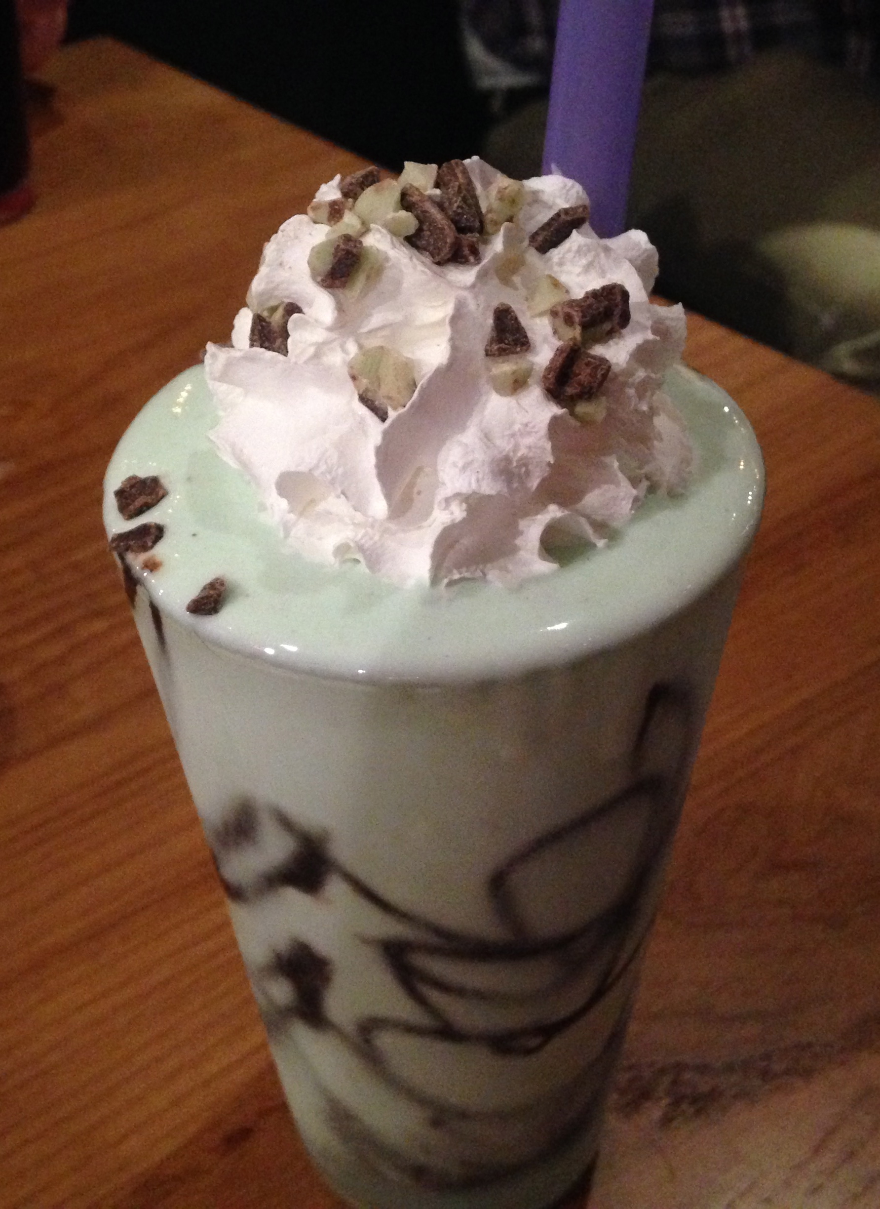 Eve orders a boozy shake. The mint chocolate chip shake features vodka, creme de cacau, creme de menthe and Andes candies on top. It’s a beautiful drink, but it’s a lot more shake than booze. In fact, we can’t taste any alcohol in here at all. You might want to save the calories and a couple of bucks and just get a regular shake. You won’t miss the alcohol, because there’s barely any in there. The boozy shakes at West Egg are much “boozier”.