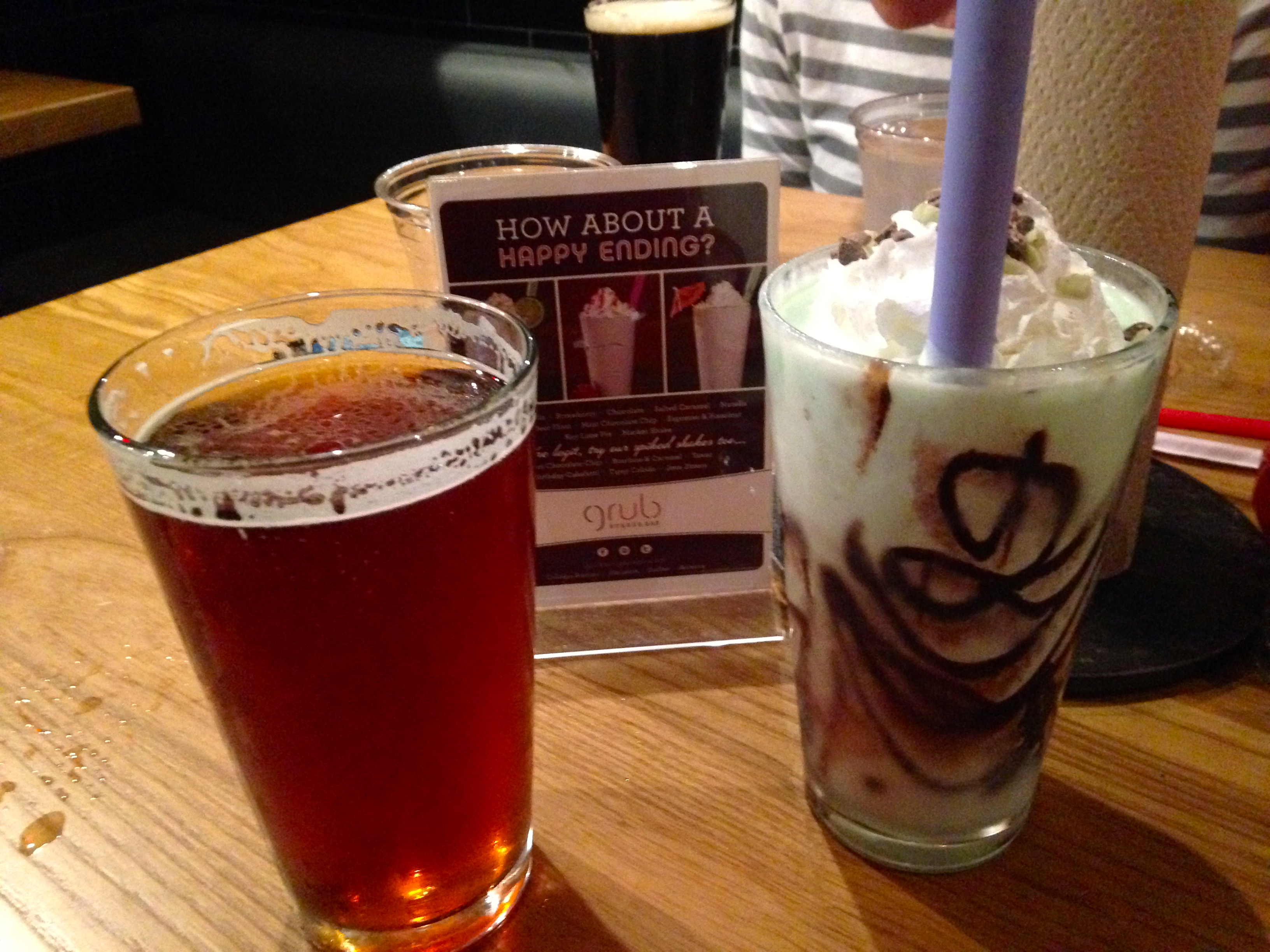 Te beer is a Red Brick Downtown Brown. It’s nice and malty and is a very smooth brown ale. What is that gorgeous green drink?