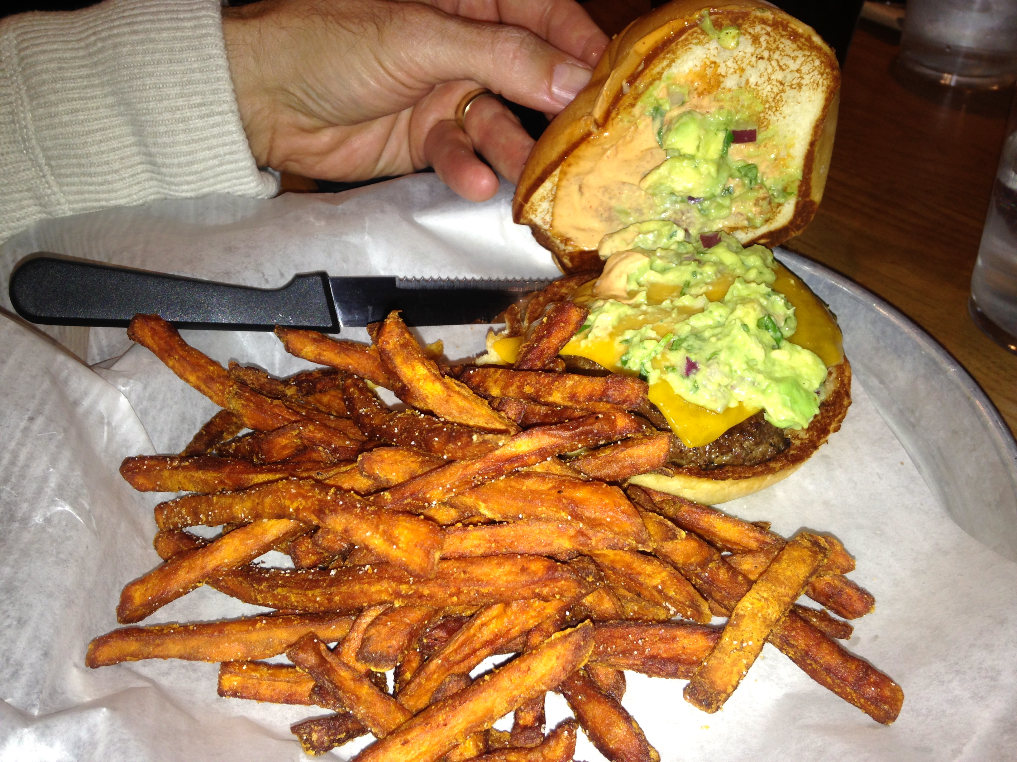 This is a better picture of the fries than the Guacapotle Burger, which is topped with chipotle aioli, guacamole, and cheddar cheese. Like Eve’s burger, it’s nice and juicy and the chipotle goes nicely with the guac. The bun is one of the reasons this is such a good burger. They claim they make them every hour and you can see them baking as you go through the line. They sell the buns to take home. You might want to pick up a package when you visit.