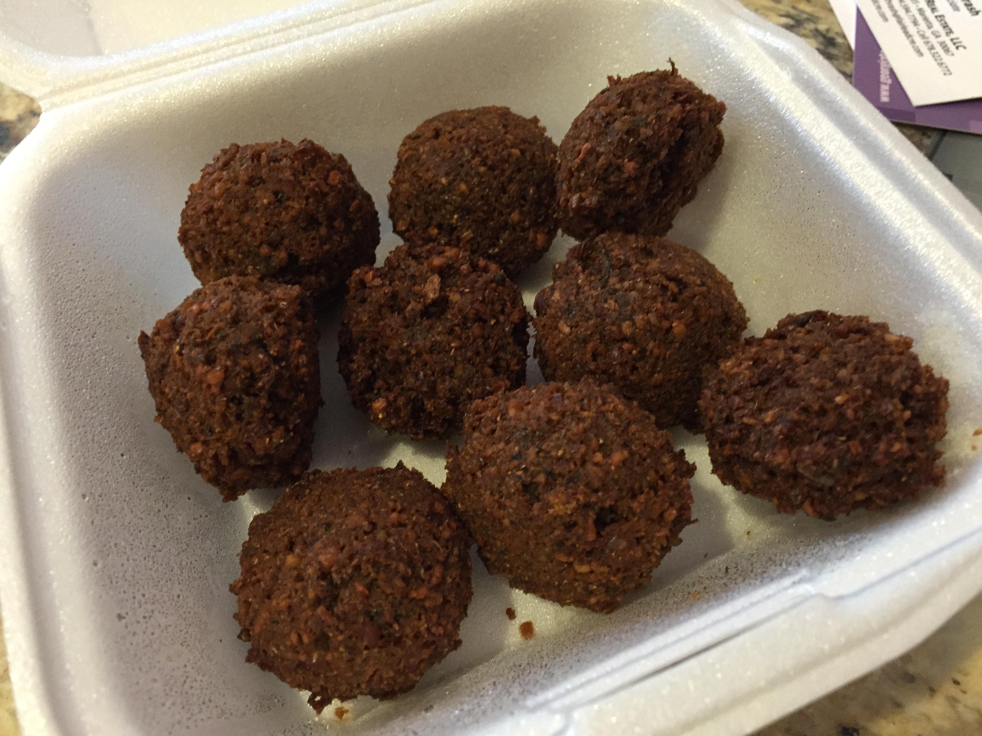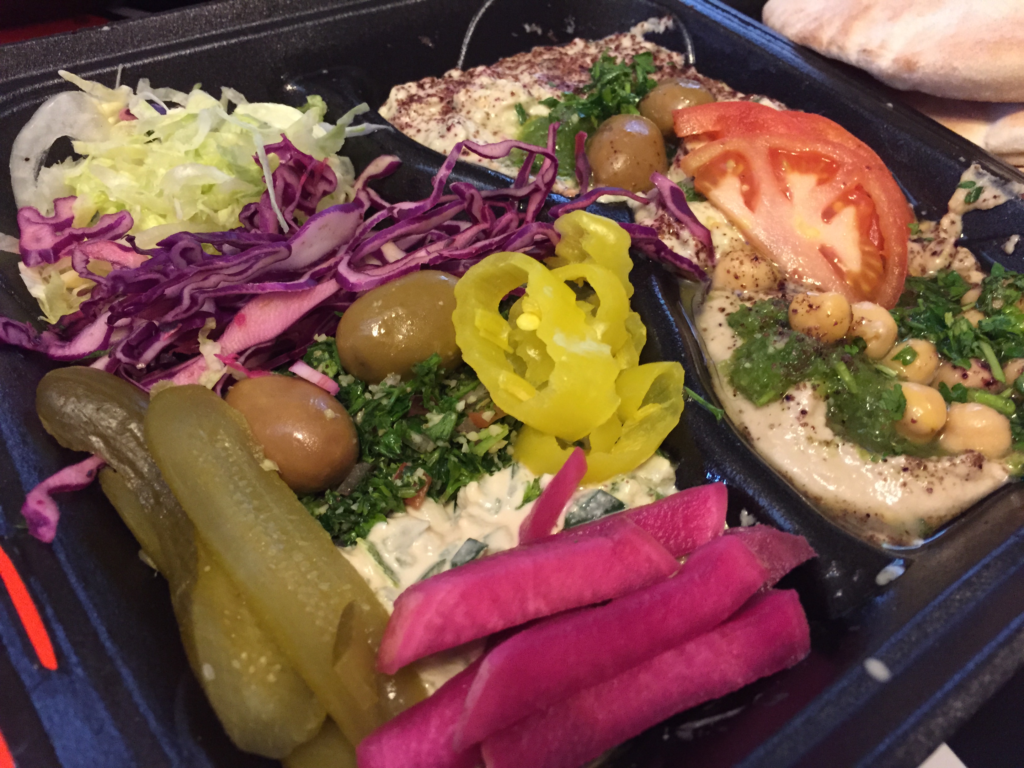 It adds some shish tawook (chicken) and kufta kabob (lamb) to go with more hummus and falafel. The chicken and lamb are made when you order. It’s fresh, hot, and tasty.