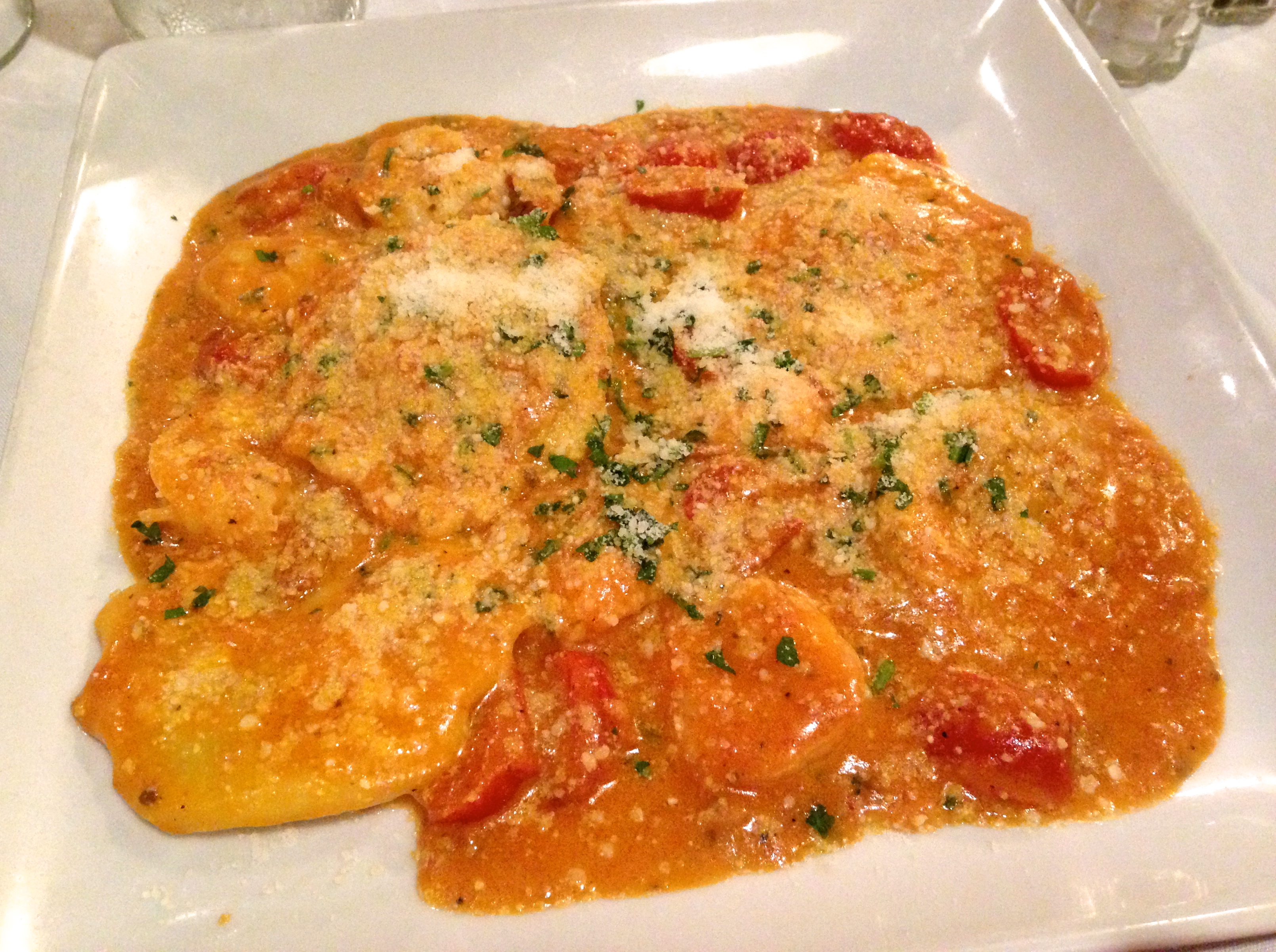 Here’s one of Chef Luigi’s specials for tonight, which Eve chooses. The crab meat and shrimp ravioli is worthy of being a special. Perfectly prepared prawns and pillows of fresh pasta are stuffed with crabmeat. Not only is this a wonderful dish, it gives this writer a good chance to use his alliteration skills.